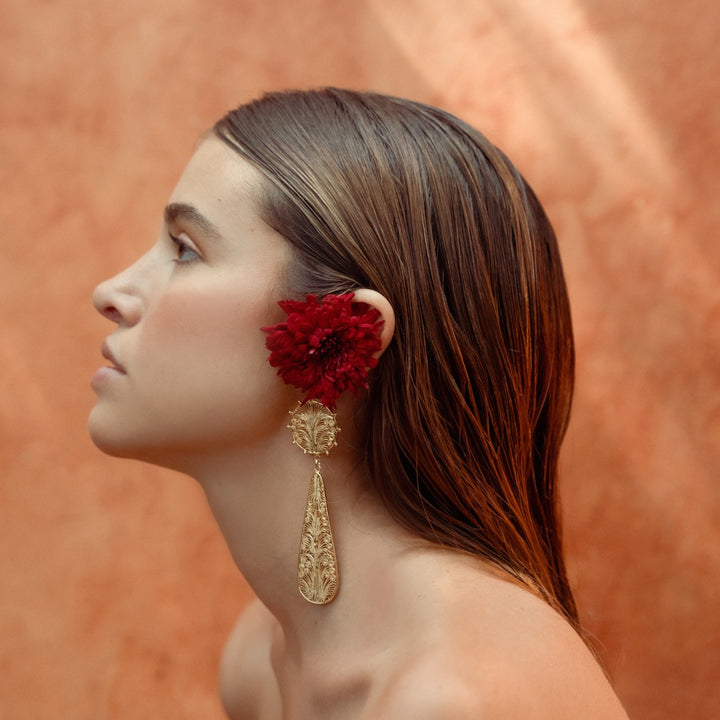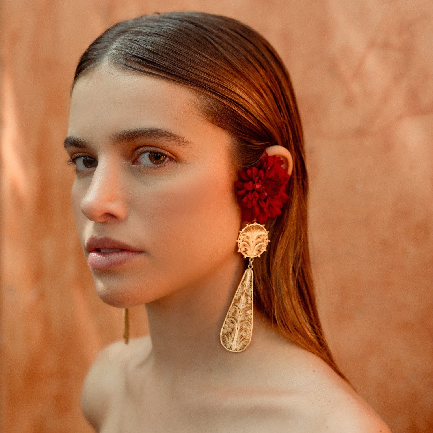 These handmade earrings are crafted from silver with a golden finish. To clean, use sodium bicarbonate, water, and a fine brush. Store them in a place isolated from the environment.