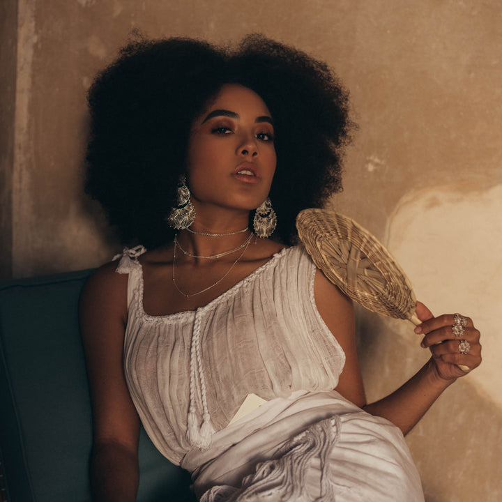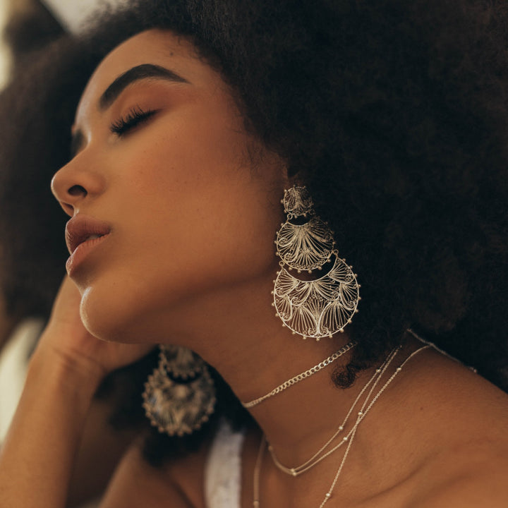 These Alma Statement Golden Earrings by Mamba are a beautiful and meaningful accessory. Part of the "ALMA" collection, they are a large, golden chandelier style that symbolize a return to oneself. Their handcrafted nature and artisan production speak to the magic of Mamba and the simple things that bring happiness.