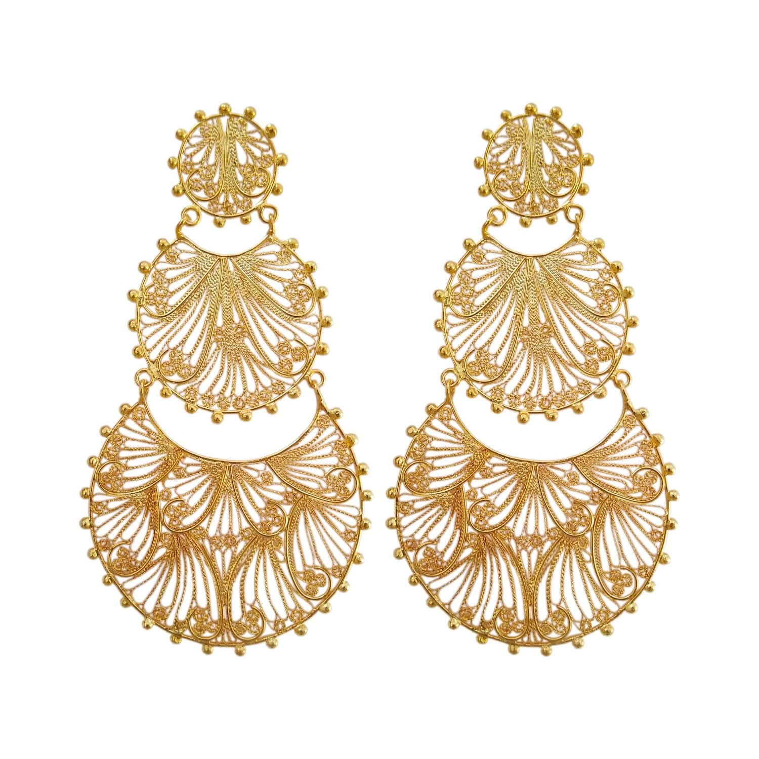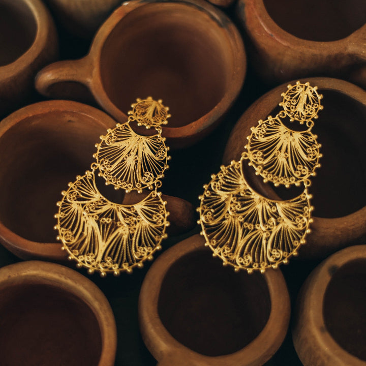 These handmade statement earrings are crafted from silver with a golden finish. To clean, use sodium bicarbonate, water, and a fine brush. Store them in a place isolated from the environment.