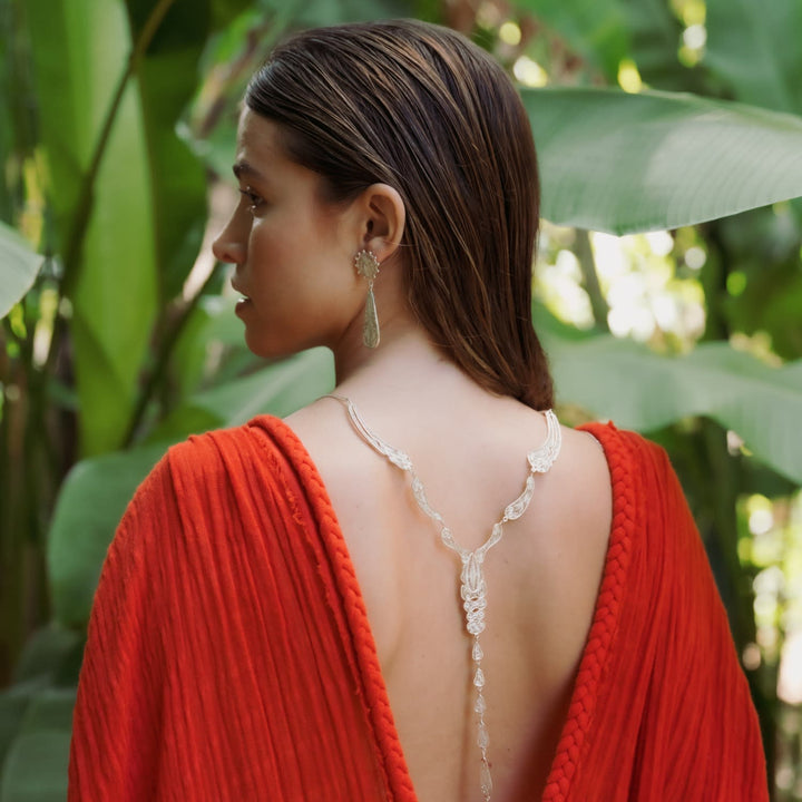 These handmade dangle earrings are crafted from silver. To clean, use sodium bicarbonate, water, and a fine brush. Store them in a place isolated from the environment.