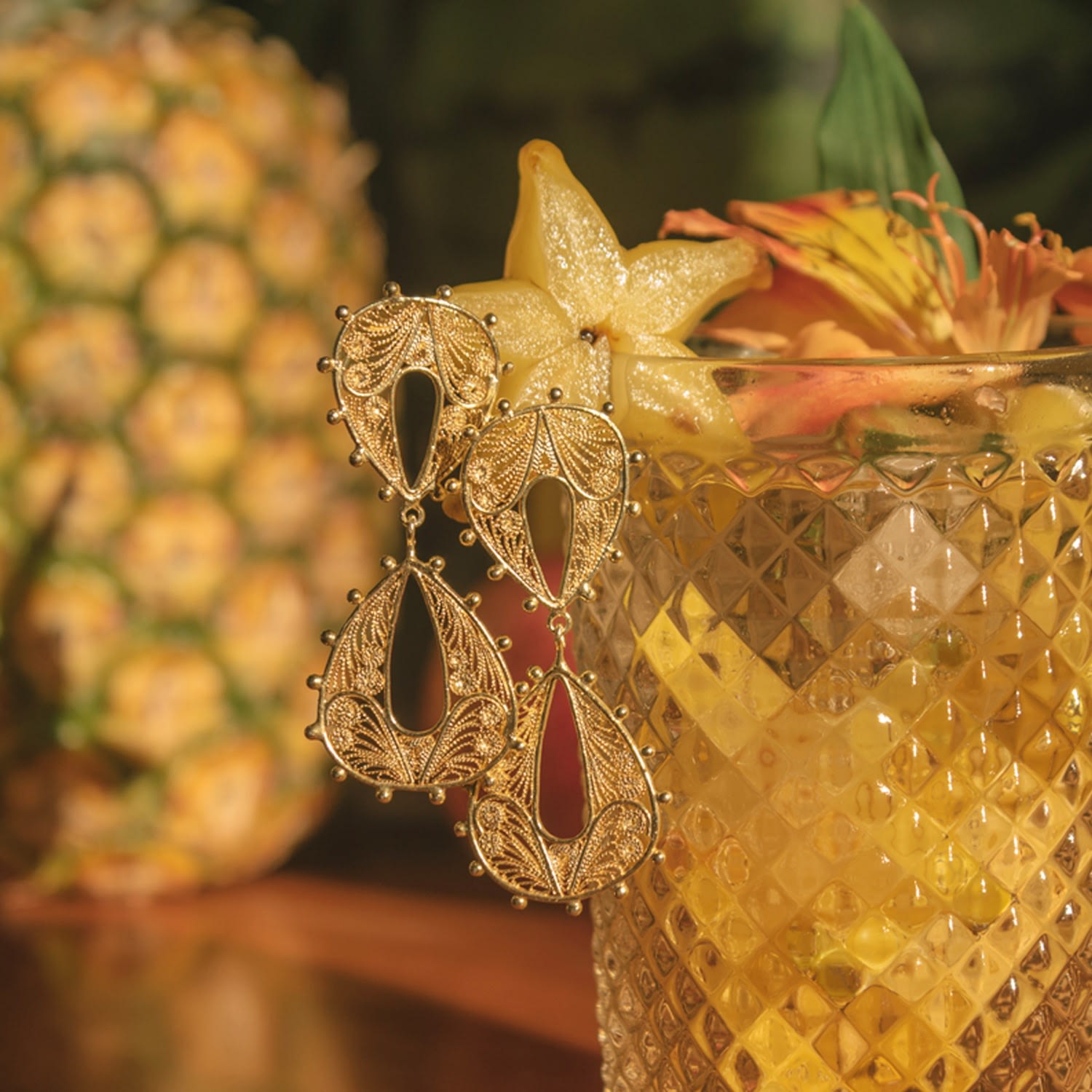 These Pandora Bow Golden Earrings by Mamba are part of a collection created to celebrate the strong and unique woman. The earrings are designed to make you smile, symbolizing the union of earth's elements and the brightness of a sunset. This handmade product has slight variations, adding to its unique charm and artisan magic.