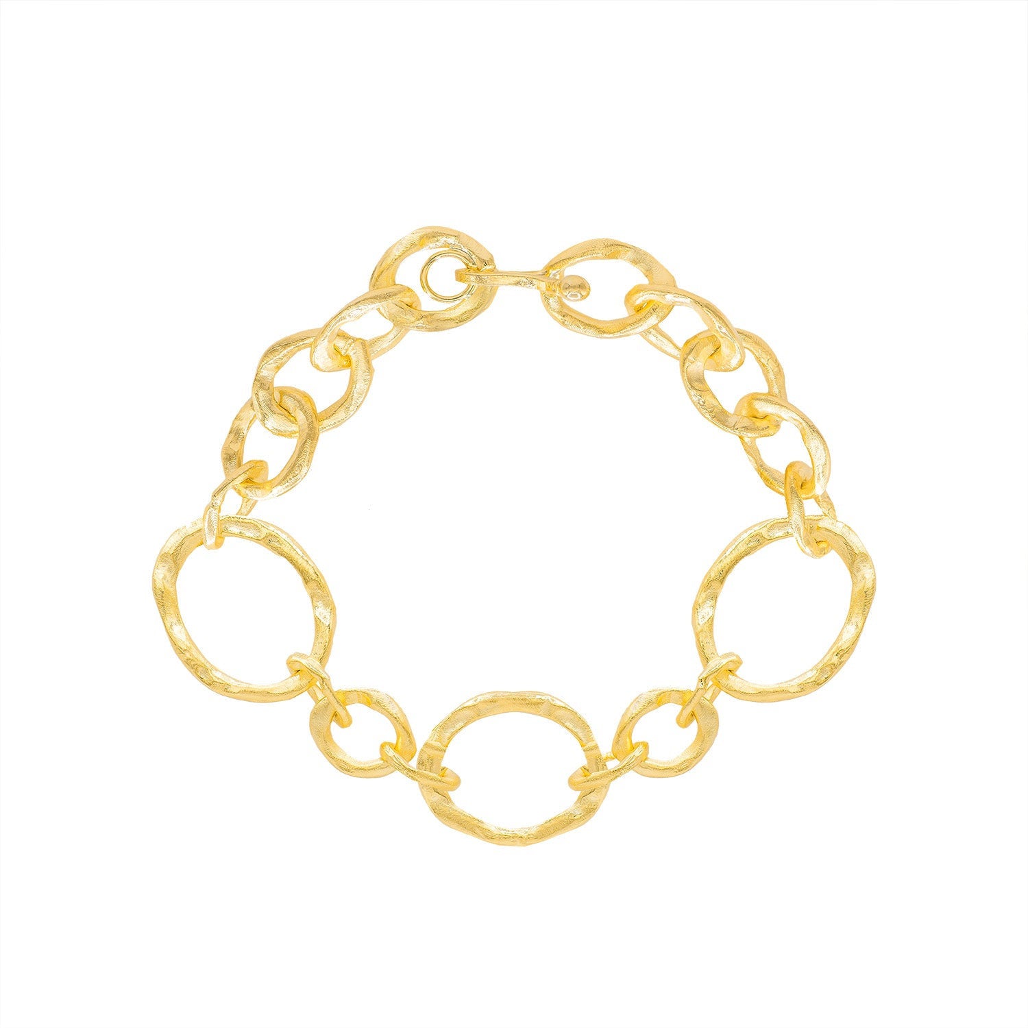 This bracelet is handmade and crafted from 18k gold-plated brass with hammered links. It is adjustable from 7 to 7.5 inches.