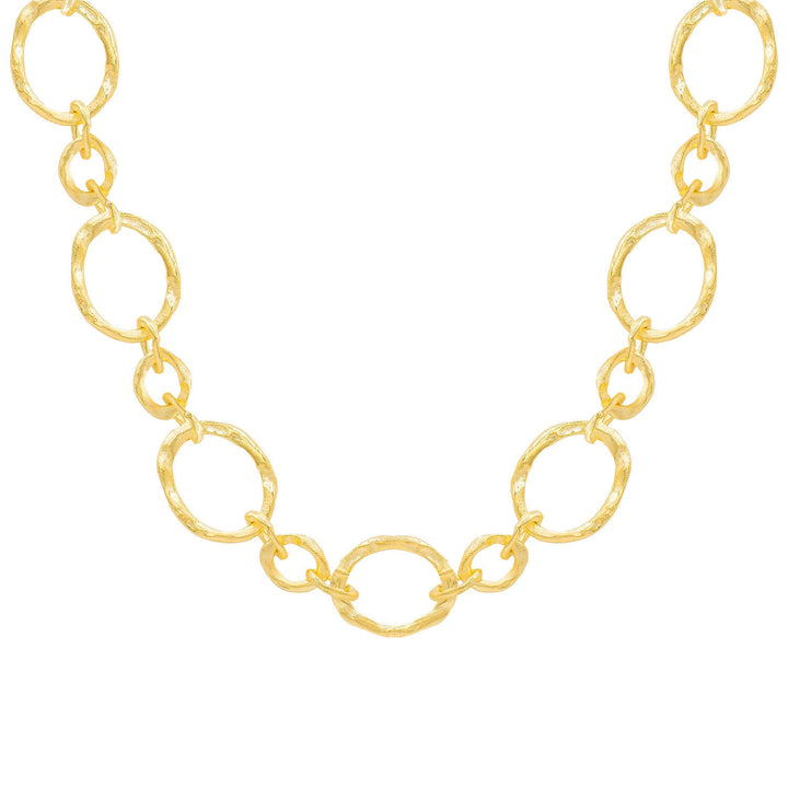 This choker necklace is handmade with hammered links. It is made of brass and base metal and is 18k gold-plated.