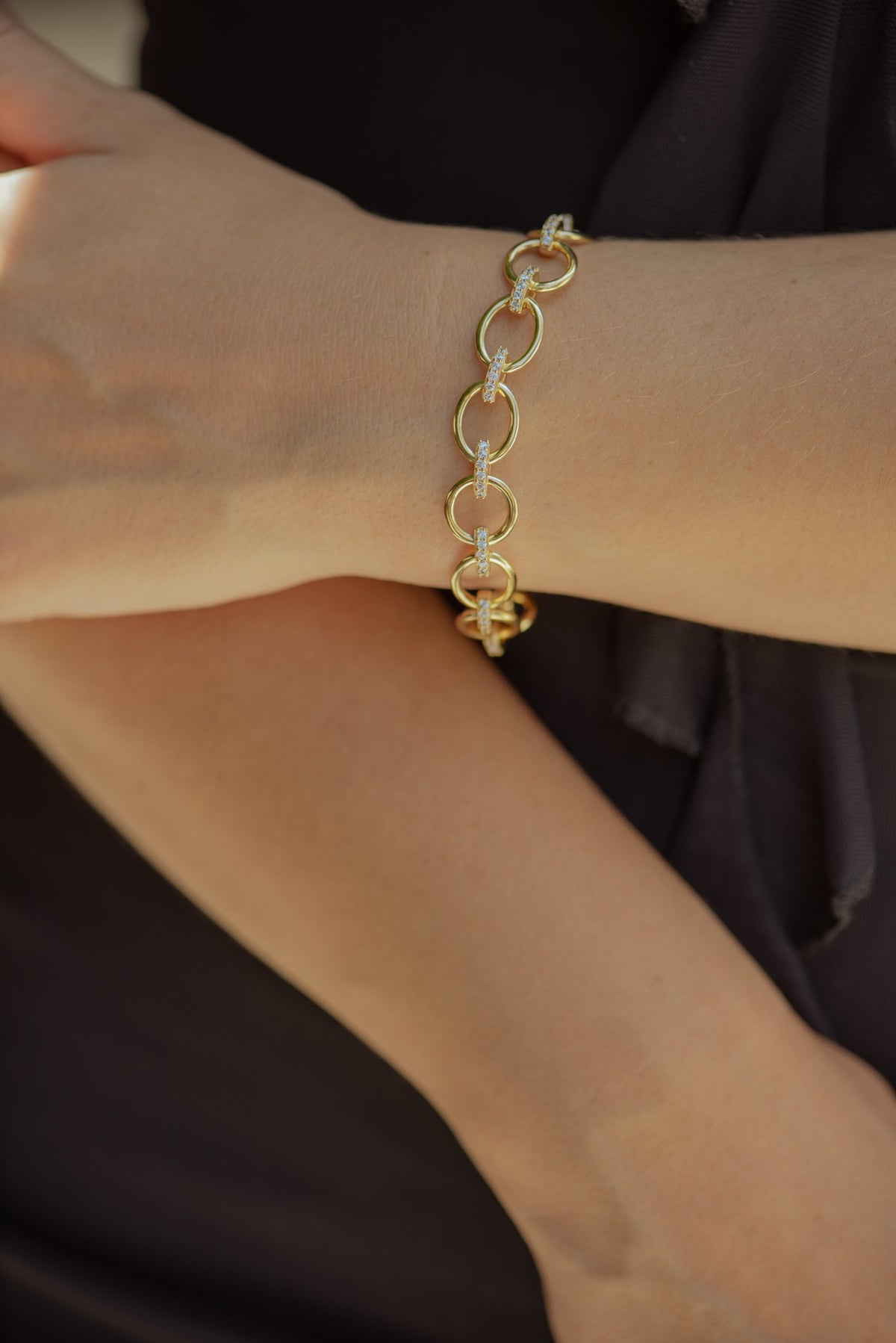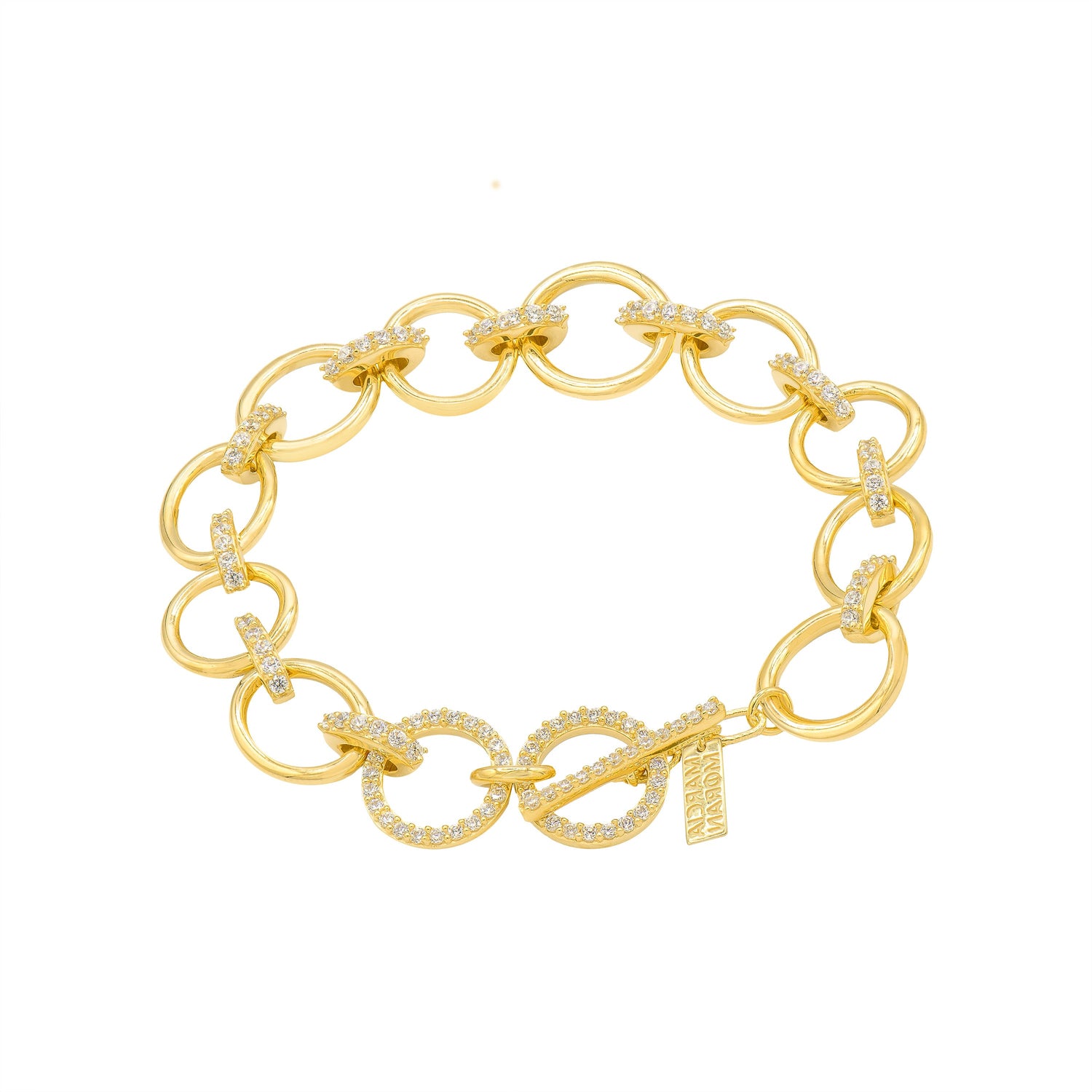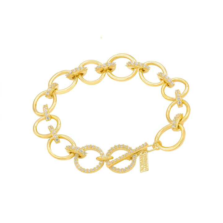 This bracelet is made of brass and base metal with 18k gold plating. It features interlinked CZ rings and measures 7 inches in length.