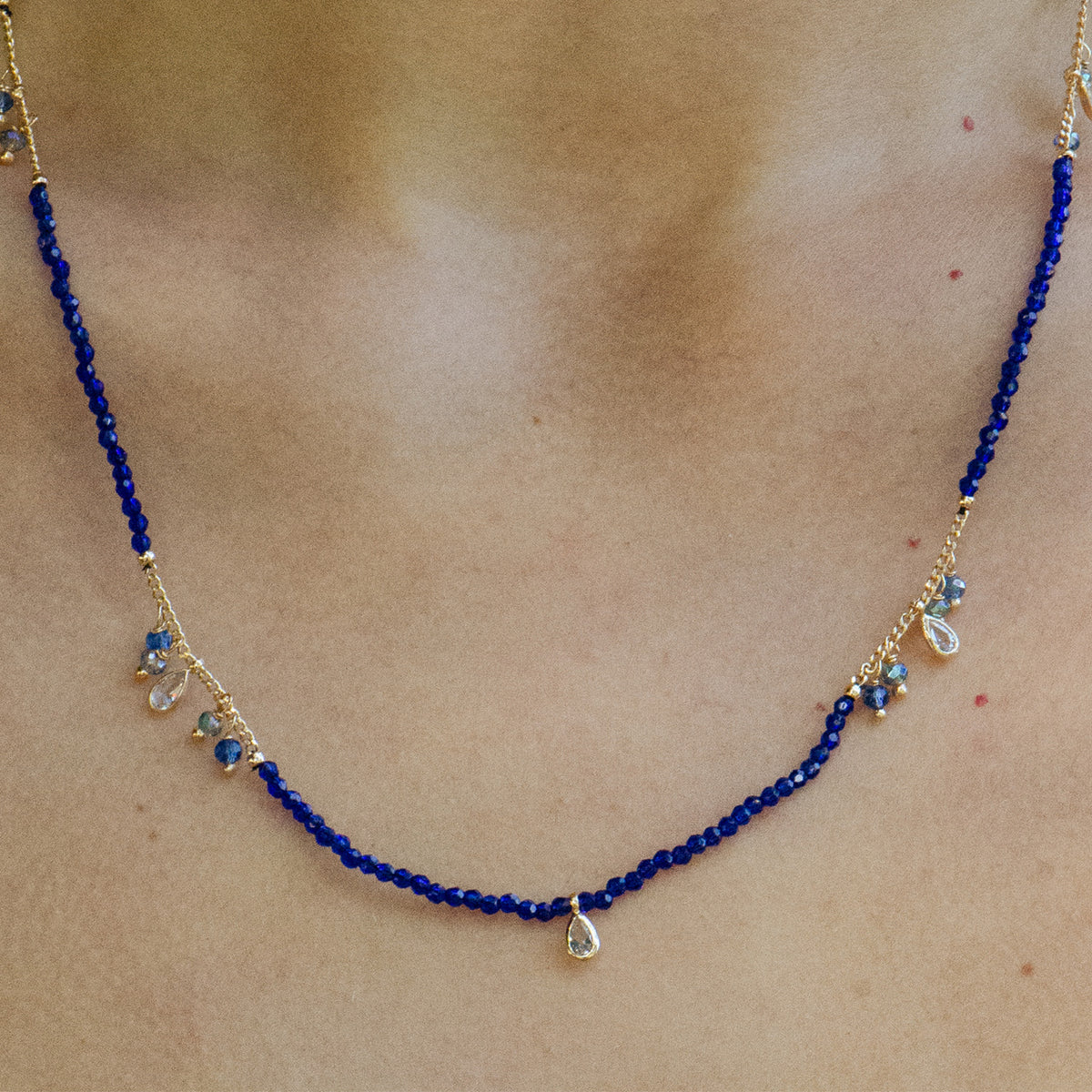 This necklace is made with 18k gold-plated metal. It features multicolor beads and cubic zirconia (CZ) stones. It measures 19 inches with a 1-inch extender.