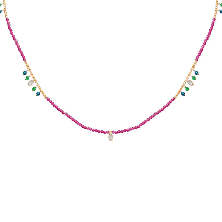 This Sirena Necklace In Red by Marcia Moran is a vibrant and elegant accessory. The 18k gold-plated necklace features multicolor beads and CZs, adding a playful and sophisticated touch. The semi-precious stones may vary in shape and color, making each piece unique. With a 2-year warranty, this necklace is designed to be enjoyed for a long time.