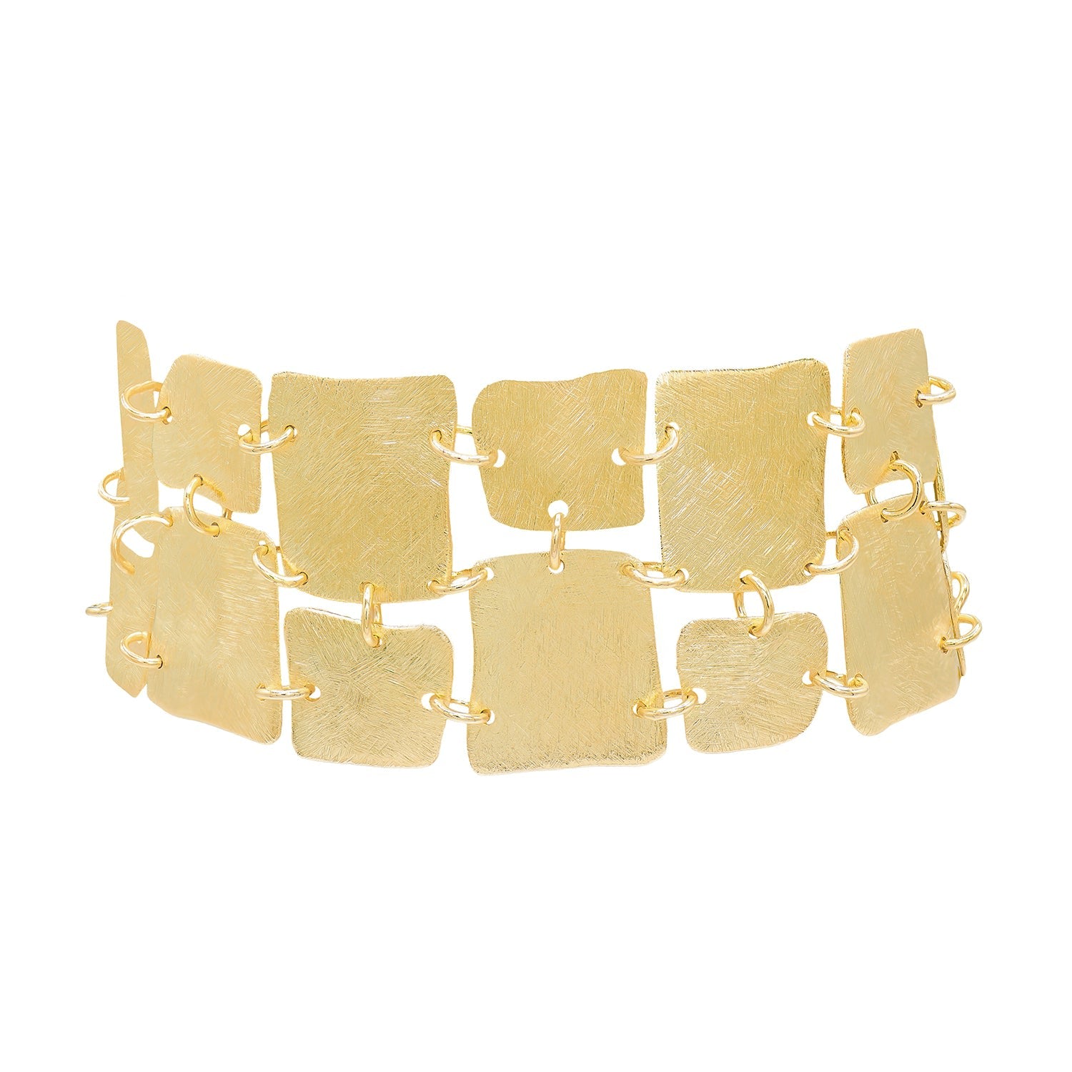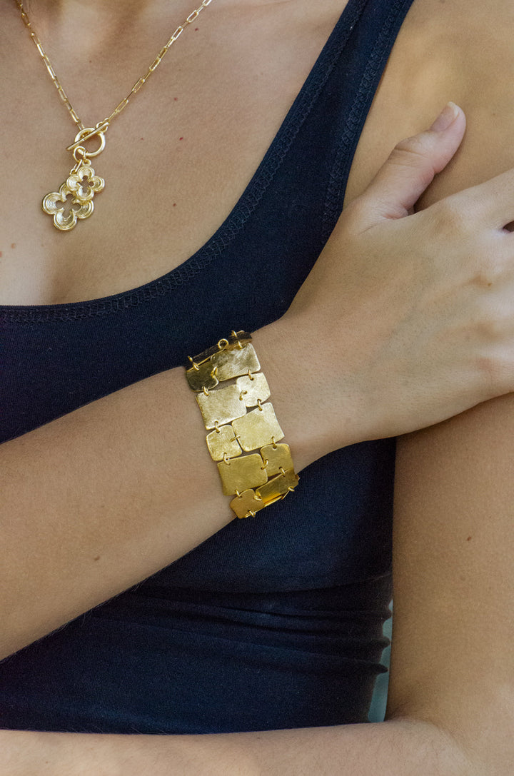 The Neptune Bracelet by Marcia Moran features an elegant and timeless design. The 18k gold-plated bracelet has an organic-shaped coin charm, adding a modern, textured element. Handmade in Brazil, it's a versatile piece that can be adjusted for a comfortable fit.