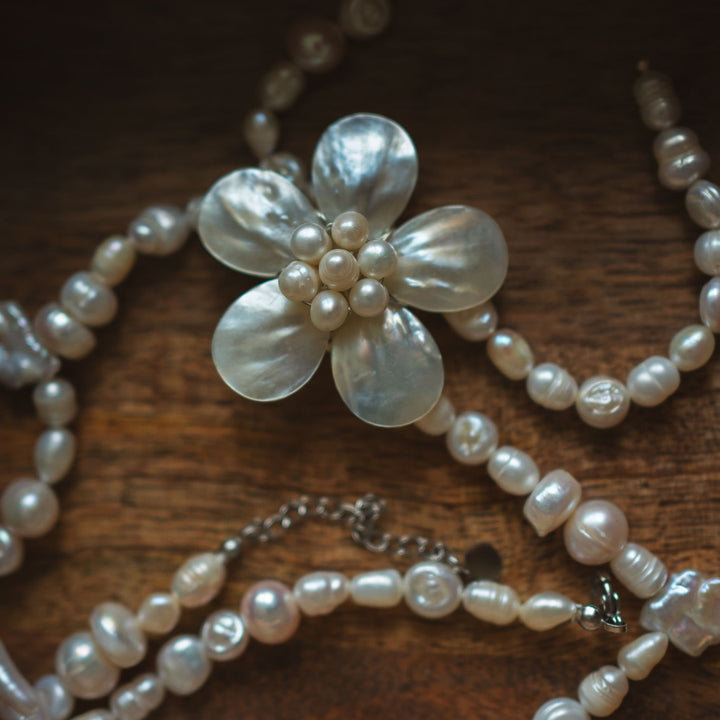 The Flower Pearl Necklace by Martina Rozenberg Smira Jewelry is a dreamy and timeless piece. This one-of-a-kind, handmade necklace features genuine freshwater pearls that radiate natural elegance. With their soft glow and delicate charm, these necklaces are perfect for romantic occasions or for simply adding a touch of effortless beauty to your everyday style.