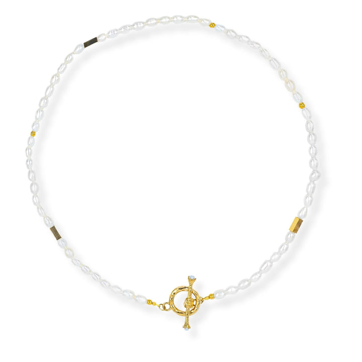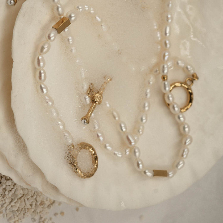 The Ondaluz - Main Pearl Necklace by Martina Rozenberg Smira Jewelry is a tribute to the ocean's timeless grace. Made from luminous freshwater pearls and featuring a delicate clasp adorned with two tiny pearls, this hypoallergenic necklace embodies the beauty of the sea and the elegance of simplicity. The gold version is 24k high-quality plated for a lasting shine.