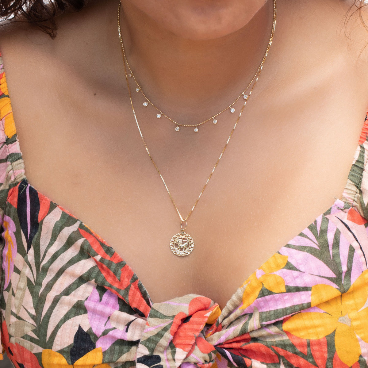 This necklace features an intricate 14k yellow gold zodiac pendant (7/8") and an adjustable 14k yellow gold box chain.