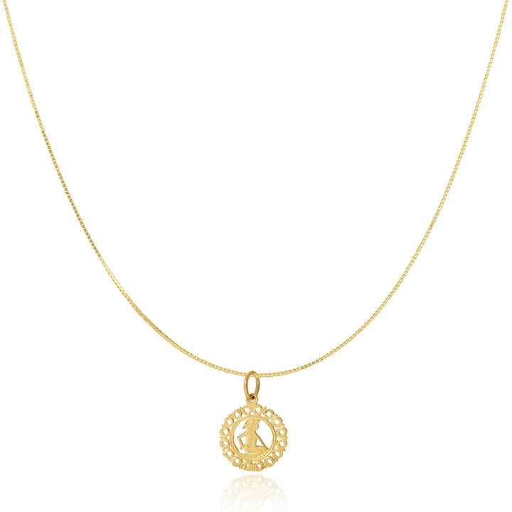 This necklace features an intricate 14k yellow gold zodiac pendant (7/8") and an adjustable 14k yellow gold box chain.