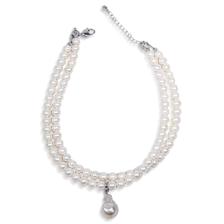 This necklace is crafted with two rows of freshwater pearls and a baroque pearl drop pendant.