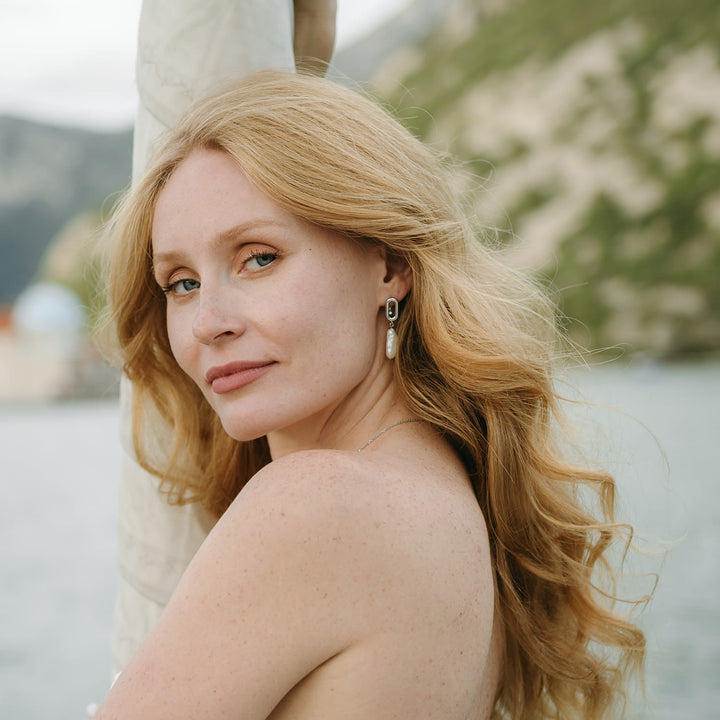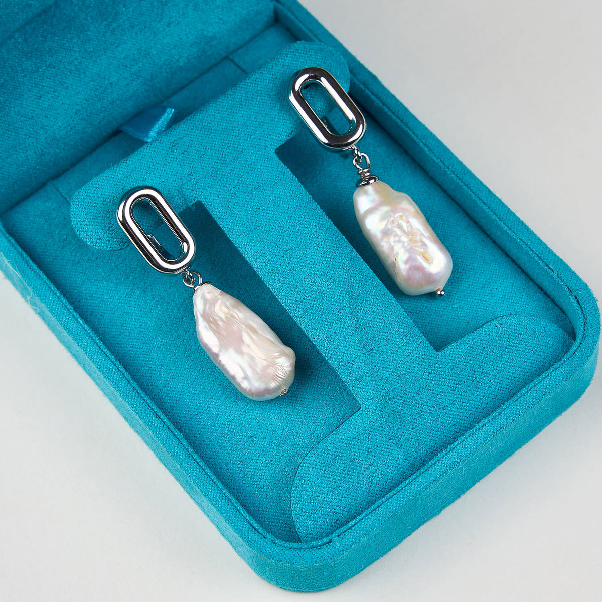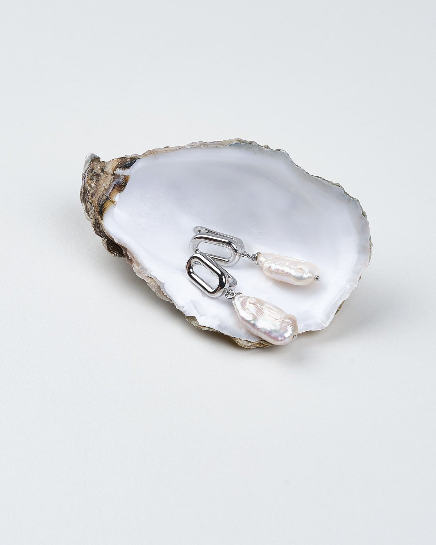 These White Geometric Baroque Earrings by Mayfair Pearls are elegant and unique. They showcase lustrous white, stick-shaped baroque pearls suspended from modern, sleek silver geometric clasps. This striking contrast between organic pearls and structured lines makes these earrings a versatile accessory for a sophisticated day-to-night style.