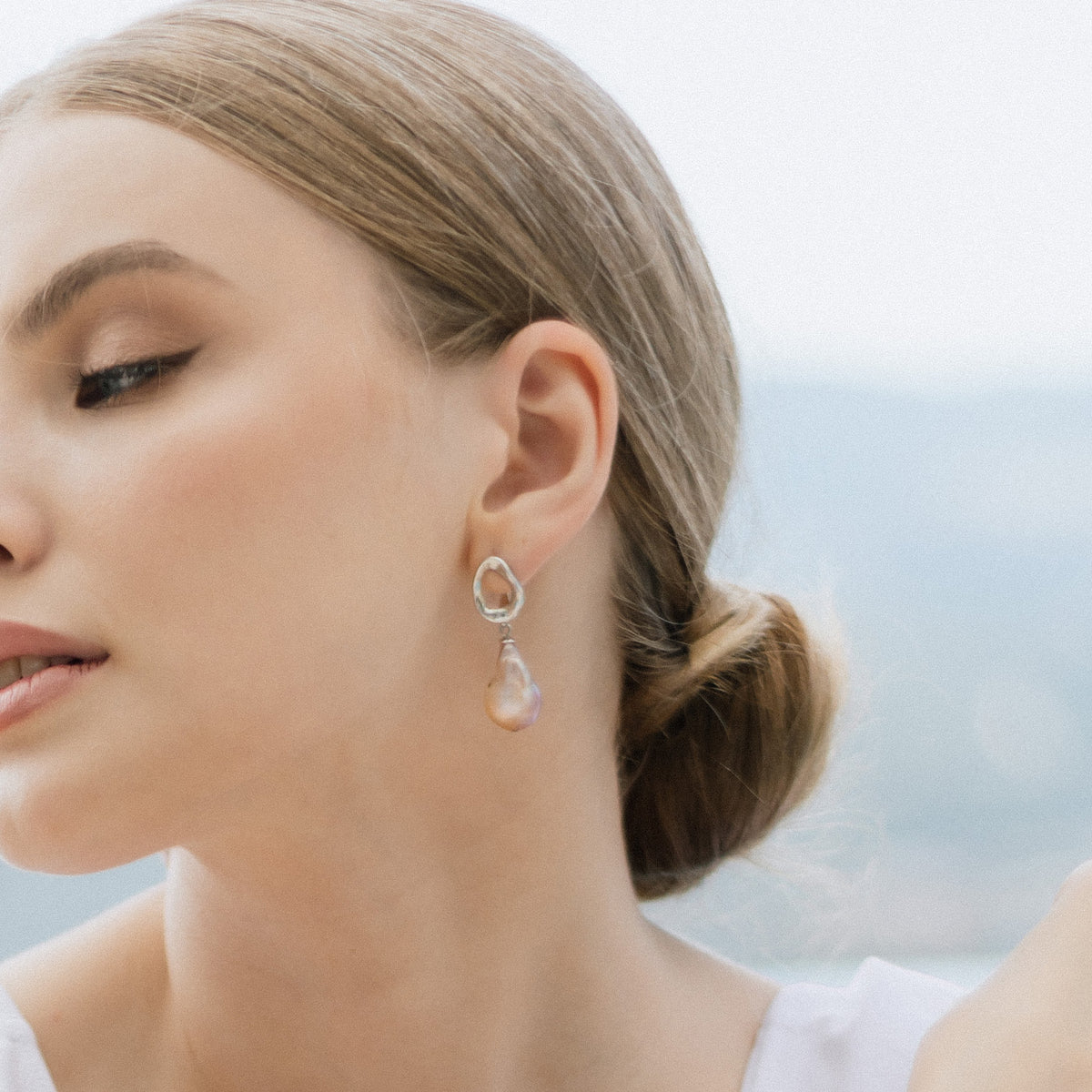 Silver Abstract Clasp Pink Baroque Teardrop Earrings