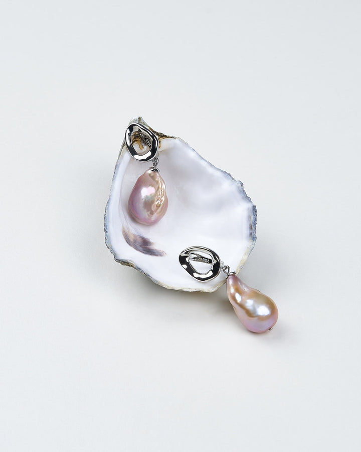 These earrings feature natural pink baroque teardrop pearls and are secured with silver abstract clasps.