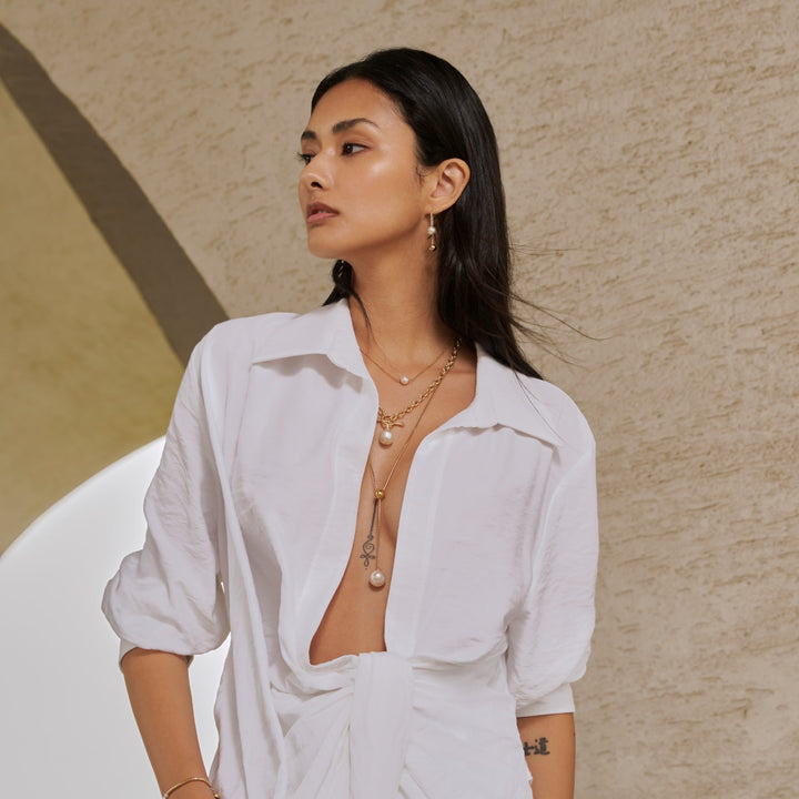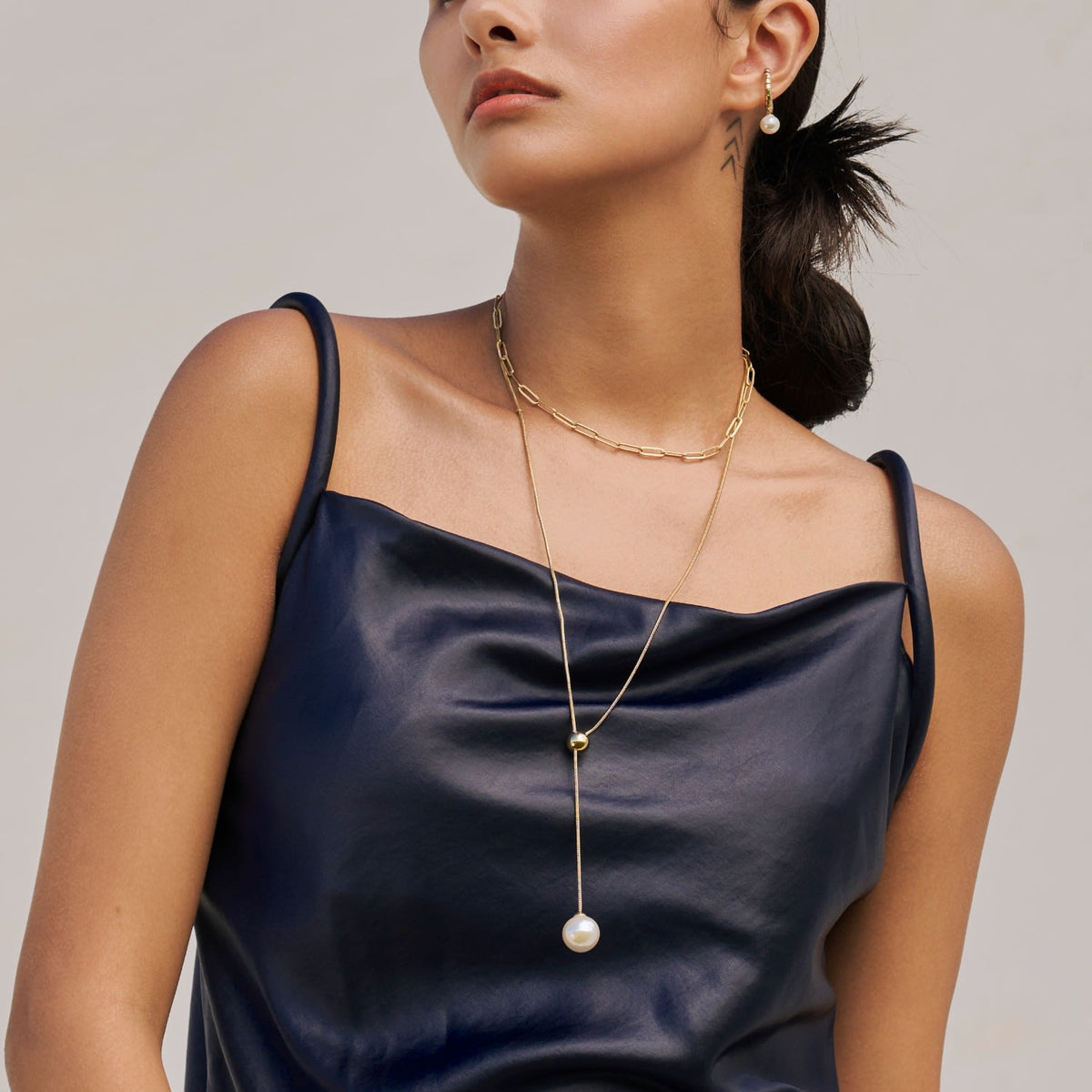 The Minimalism Galet Lariat Necklace by Me30 is a chic and sophisticated accessory. Delicate lines wrap around the neck, with a single bead pearl hanging from the pendant line. The adjustable chain with a perfect-fit closure makes for a comfortable and hassle-free wearing experience. This trendy yet elegant necklace is perfect for adding a casual luxury to any collection.