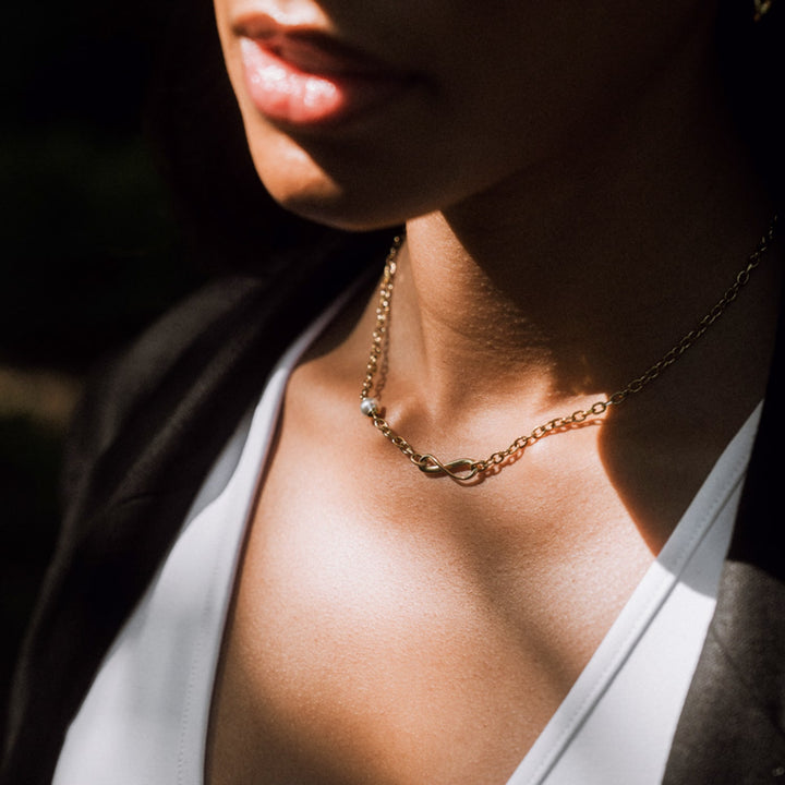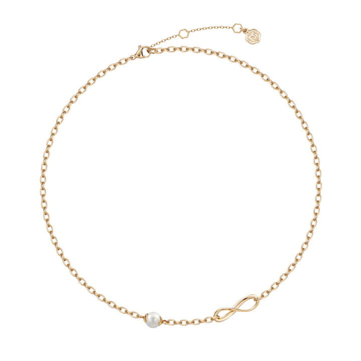 The Urban Chic - Unlimited Necklace by Me30 is a stylish and symbolic accessory. This necklace features an asymmetrical infinity symbol, representing the idea of no restrictions, along with pearls that symbolize elegance and ease. The combination of the infinity symbol and pearls reminds the wearer that life can be more elegant and smooth through simple mix and match.