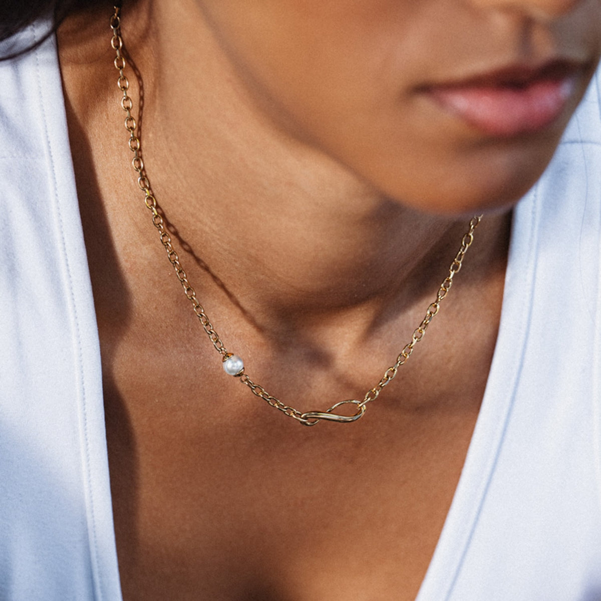 This necklace is made from 316L stainless steel with a thick 18k gold plated finish and features a handcrafted pearl.
