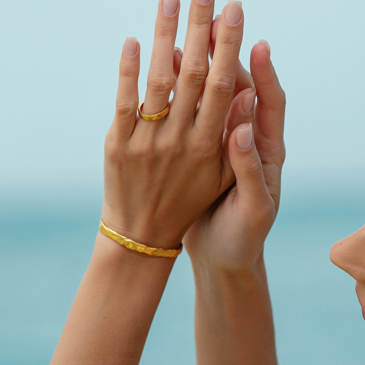 This band ring is a set with a bangle. The set is crafted from textured and hammered gold.