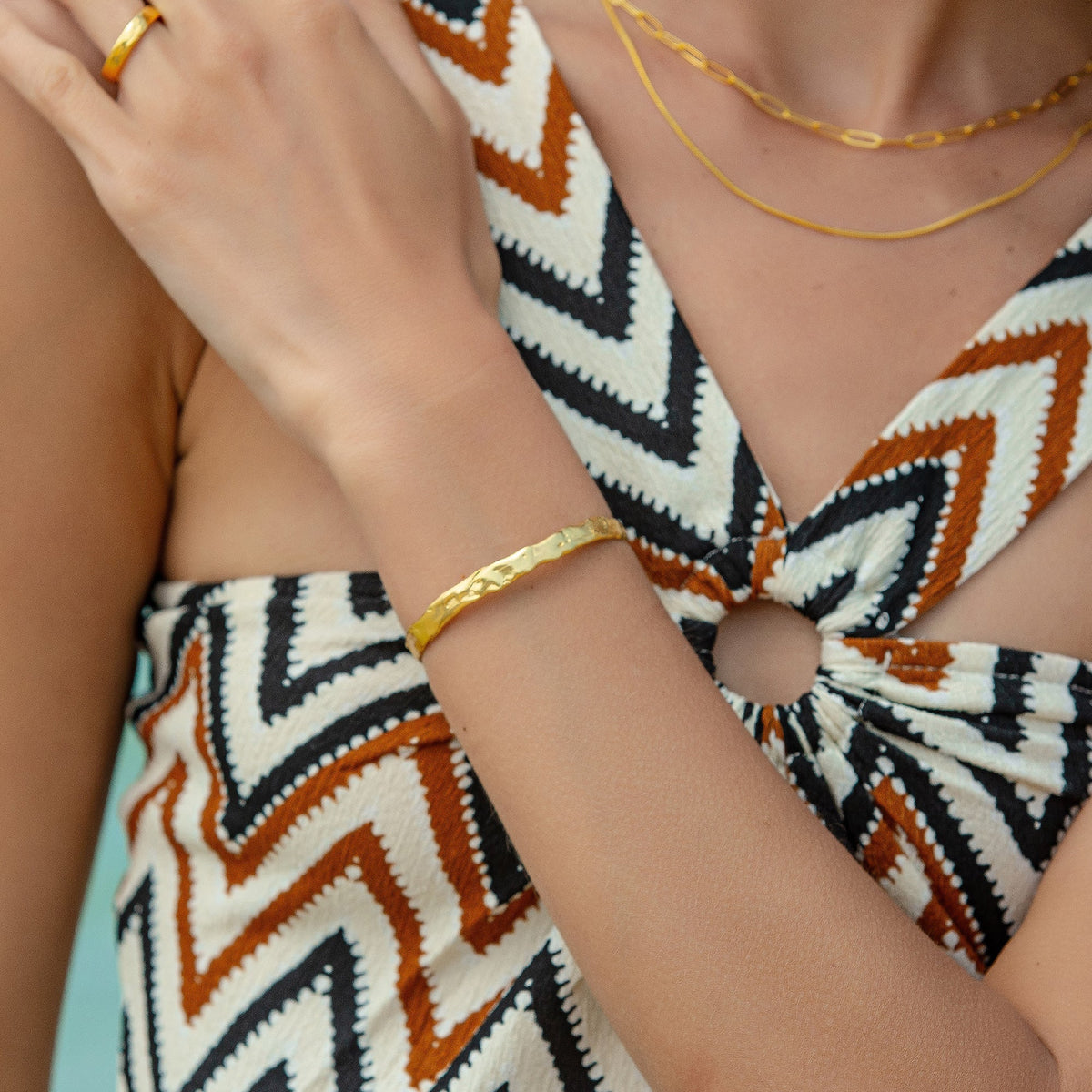 This Naturally Textured Thin Cuff Bangle & Textured Hammered Ring Set In Gold by Mejoma is a unique and elegant set. The bangle and ring offer a unique and natural texture that adds a touch of elegance to any outfit.
