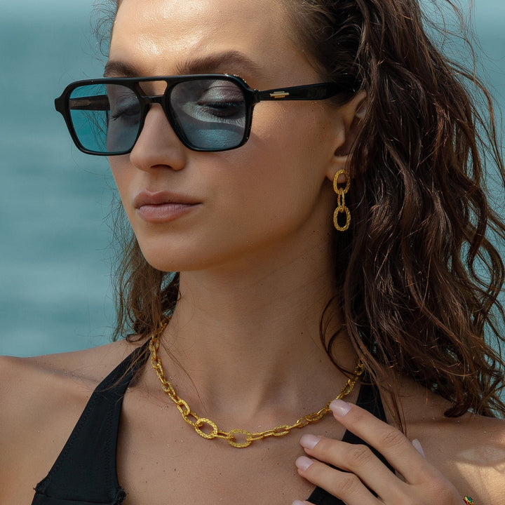 This Ancient Allure Textured Gold Link Necklace & Bracelet Gift Set by Mejoma is a timeless and charming set. Made from high-quality materials, this set features intricate textures and unique links that exude elegance and sophistication. The perfect pairing for any occasion, it adds a touch of allure to any outfit.