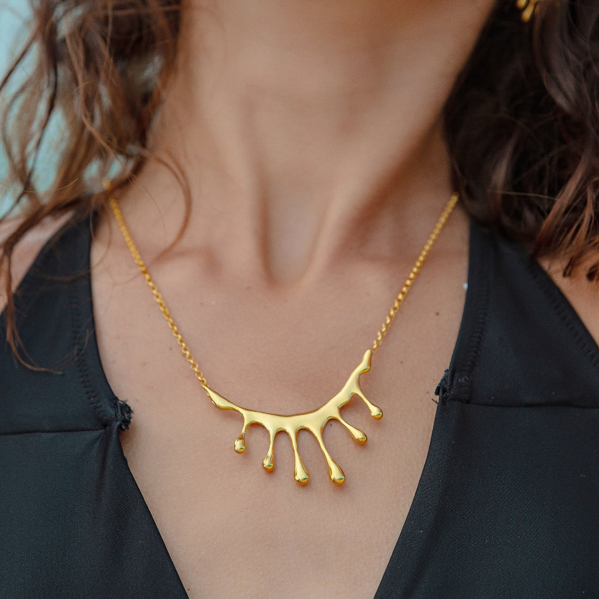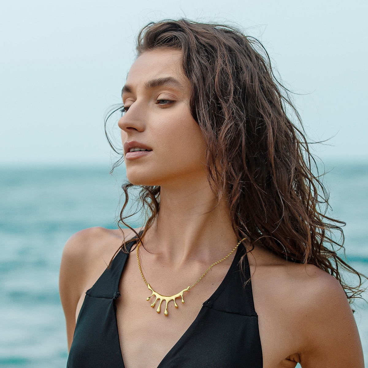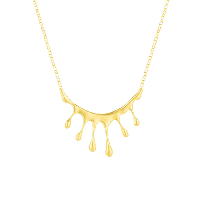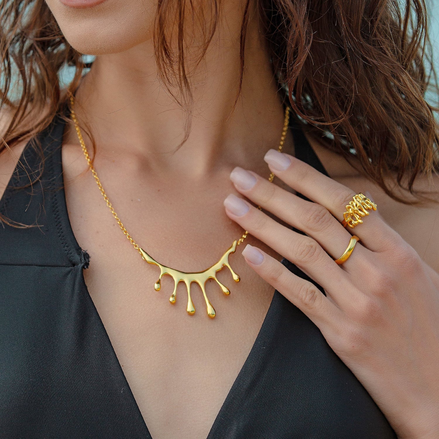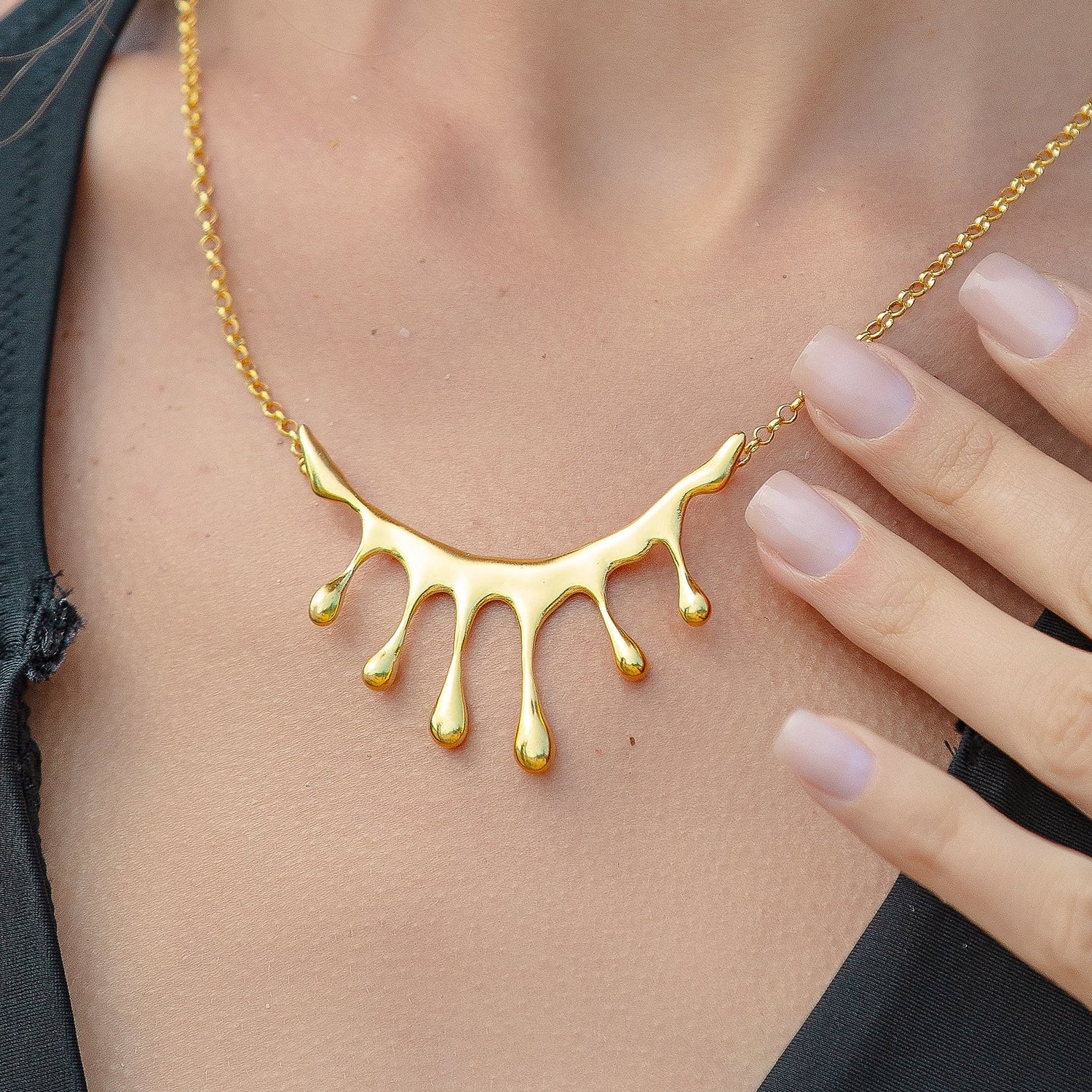 This Dripping Gold Large Melting Necklace by Mejoma is a unique and elegant piece that adds a touch of fluidity and grace to any outfit. The beautifully designed pendant has a sophisticated, contemporary look that is perfect for both casual and formal occasions. The adjustable chain offers versatility, allowing you to wear it at a length that perfectly suits your neckline.