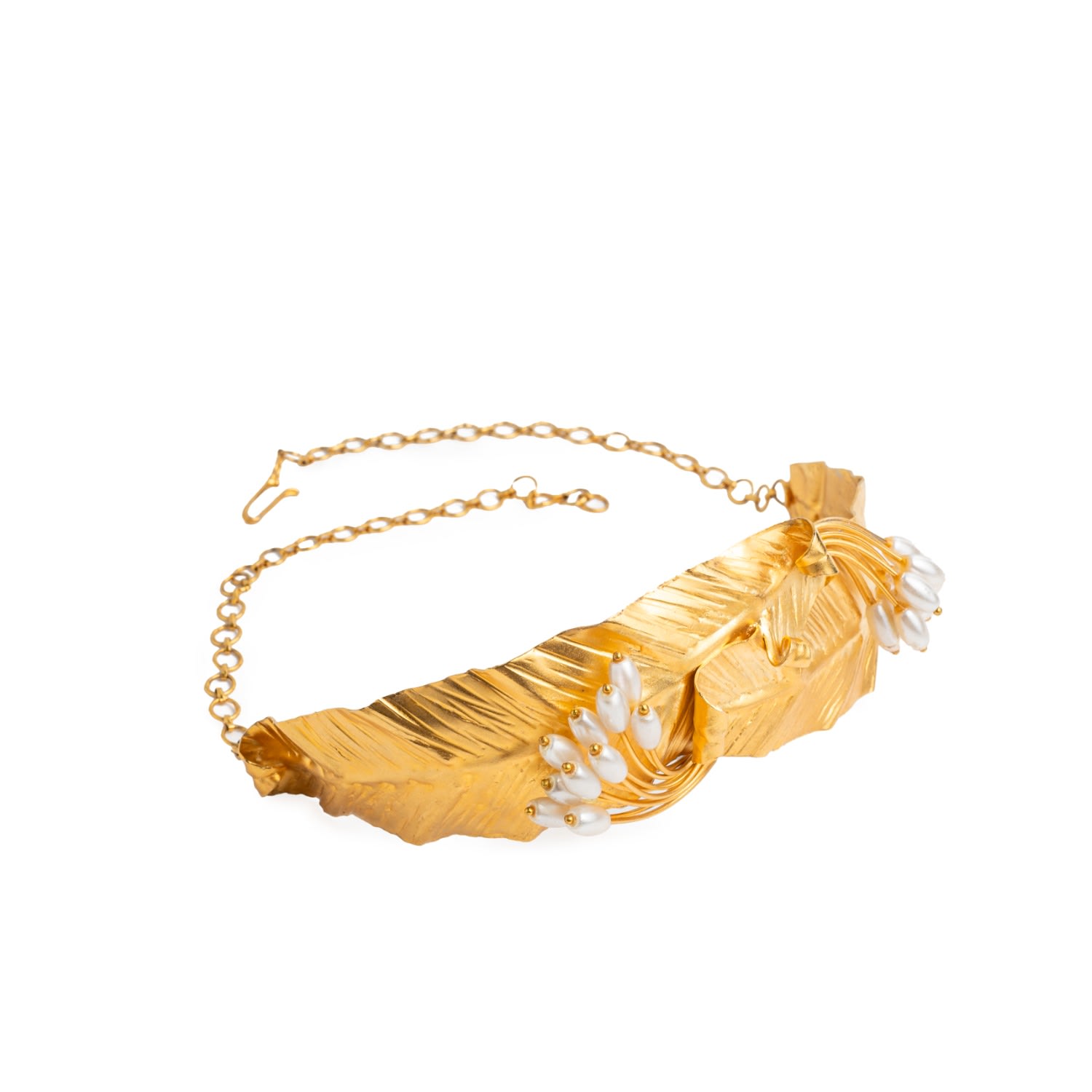 This choker is made with 24k gold-plated leaves and features white pearls. It has an adjustable chain.