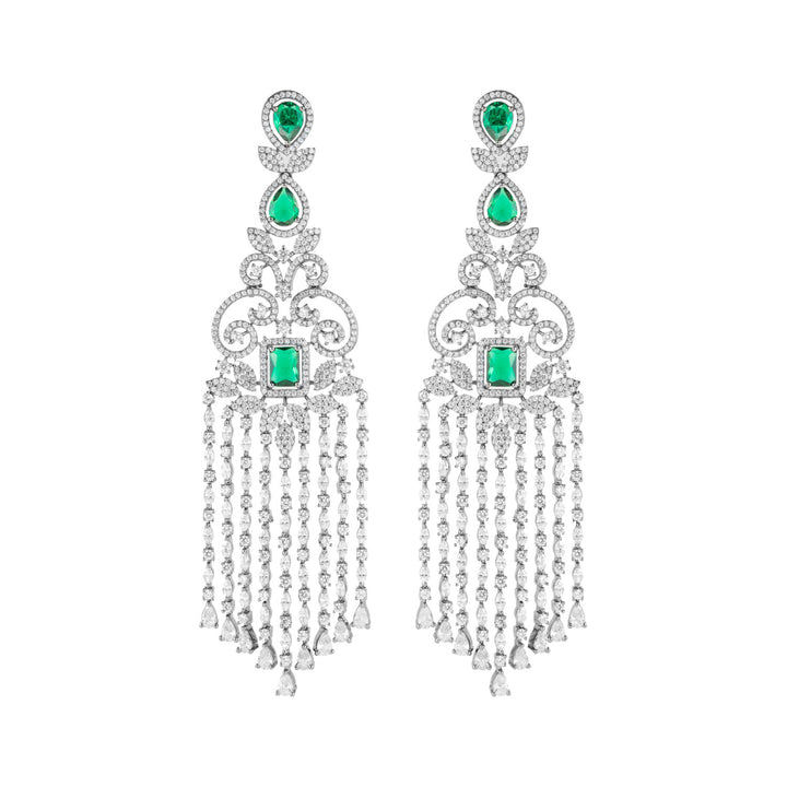 These Antoine Green Earrings by Meraki by Rashmi Bajaj exude a timeless glamour and are a statement of refined elegance. These push-back earrings feature a cascade of premium quality American diamonds meticulously arranged to create a sparkling chandelier effect. A beautifully set gemstone at the heart of each earring and the graceful drop design ensure this piece is perfect for formal events.