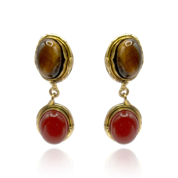 These clip-on earrings feature carnelian and tigereye gemstones on a brass clip-on base.