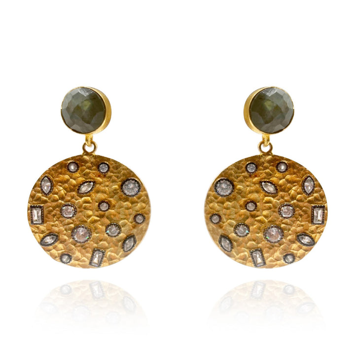 The Gold Plated Brass Disk Earrings With Cubic Zirconia Embellishments by Michael Nash Jewelry are a dazzling statement accessory. These dangle earrings feature a combination of navette and round cubic zirconia on a disk. They descend from a lustrous Labradorite round stone, and all are elegantly encased in gold-plated brass, elevating your style with a touch of glamour.