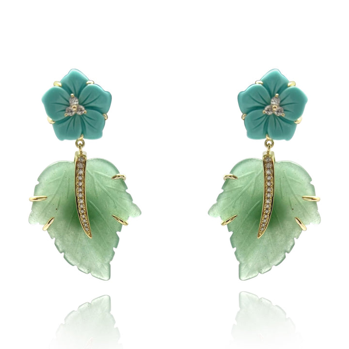 These Turquoise Flower Earrings With Jade Leaf Drop by Michael Nash Jewelry are an elegant and versatile statement. The beautifully carved turquoise flowers and jade leaf drops create a timeless design with a natural, sophisticated feel. These earrings are a jewelry staple that effortlessly complement any outfit, whether it's for a casual day out or a glamorous event.