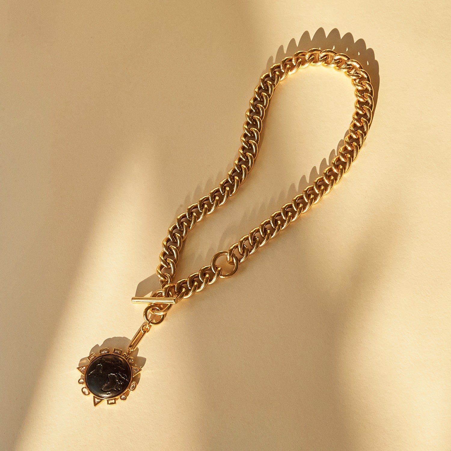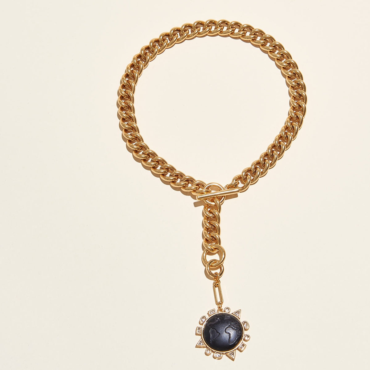 This necklace features a carved globe charm with a gold compass etched on the reverse. It is finished with an adjustable toggle closure.