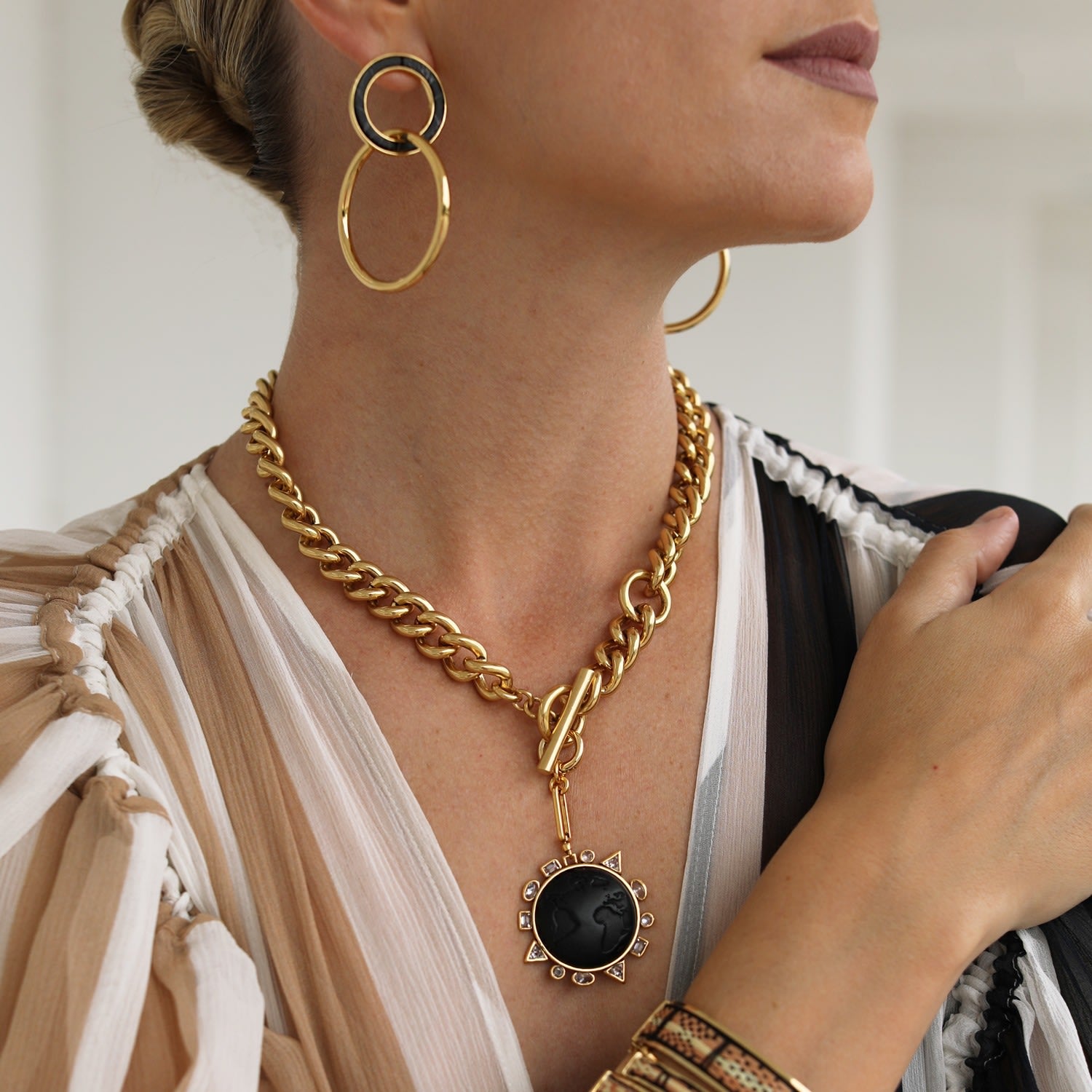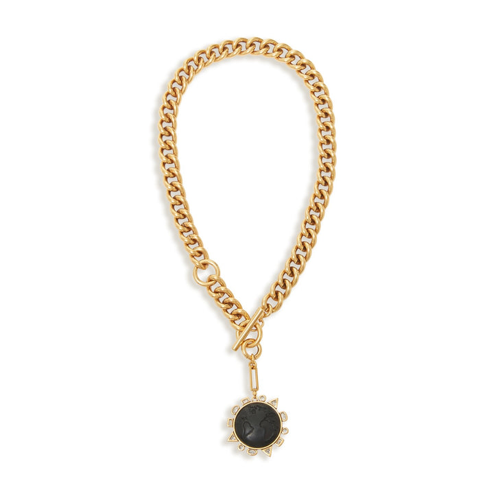 This Odyssey Necklace by Mignonne Gavigan is a statement piece rooted in the idea of connection and optimism. The carved globe pendant, with a gleaming gold compass on the reverse side, symbolizes a journey of discovery. Its adjustable toggle closure and removable charm offer versatility, allowing you to wear it as a bold statement or layered for a "more is more" mantra. This is a powerful and elegant piece that offers two ways to wear and a promise of optimism.
