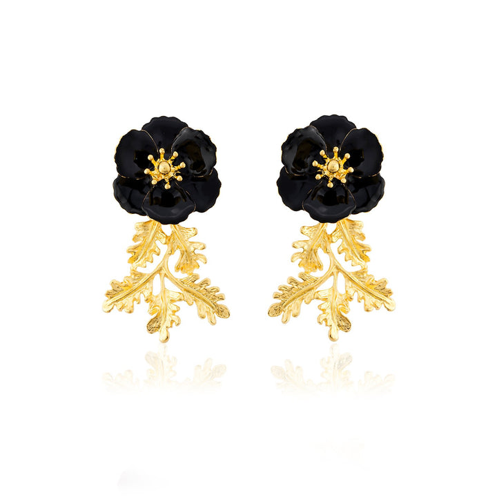 These Black Leafy Blossom Flower Earrings by Milou Jewelry are both stylish and functional. They are made with 22-karat gold-plated brass and feature an enameled flower part and a gold leaf part that can be used separately. They are nickel-free and have a post-back design.