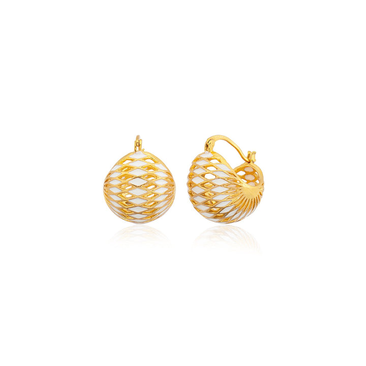 These Basket Earrings - White by Milou Jewelry are a sophisticated and playful accessory. Their unique and noticeable design is sure to catch everyone's attention, making them a fun and stylish statement piece. Handcrafted with 22K gold plated brass and a clean white enamel, these super light earrings offer a comfortable fit and a touch of modern artistry, perfect for adding a chic and creative touch to any outfit.