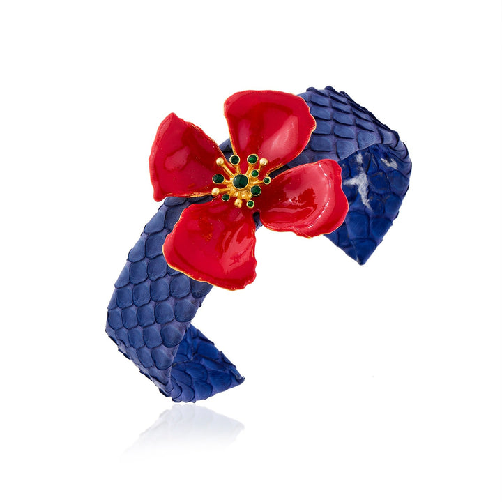 The Red Hibiscus Flower Adjustable Blue Leather Cuff Bracelet by Milou Jewelry is a beautiful and passionate accessory. The hibiscus flower symbolizes beauty, charm, and glory, with the red color representing passion and deep romantic love. This cuff bracelet is handmade with 22K gold-plated brass, blue leather, and enamel details on the flower buds.