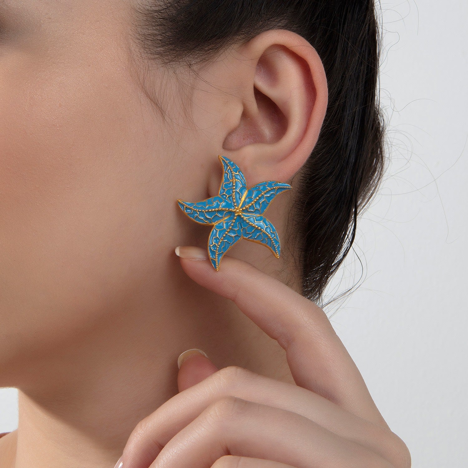 These Light Blue Starfish Earrings by Milou Jewelry are a charming and symbolic accessory for summer. The starfish is a powerful symbol of guidance, vigilance, and divine love, adding a deeper meaning to these playful earrings. Their lightweight design makes them perfect for all-day wear, and the vibrant color adds a fun, fresh touch to any look. They are a unique and heartfelt piece that celebrates the beauty of celestial and aquatic symbols.