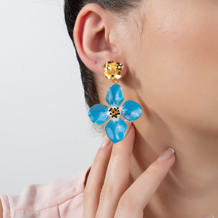 The Light Blue Clover Flower Drop Earrings by Milou Jewelry are a harmonious and naturalistic accessory. These nickel-free drop earrings are handmade with 22k gold-plated brass and enamel. They combine petite and clover flowers, symbolizing calm inner strength and innate prosperity. The design creates a strong sense of movement and is perfect for adding delicate charm to your look.