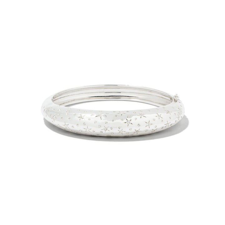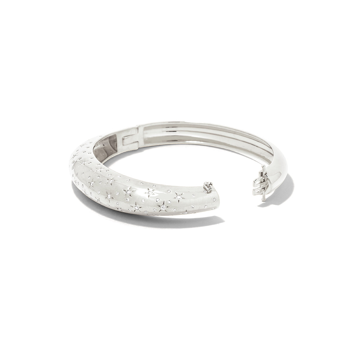 This Fizzy Bracelet by Minnie Lane is a tribute to the celestial elegance of a starlit night. Originally a custom one-off piece, its stunning design is now available to you by popular demand. Natural white topaz stones are artfully scattered across a polished dome surface, creating a dazzling effect. This cuff is perfect for a glamorous statement and can be layered with the gold Fizzy bracelet for a truly head-turning look.