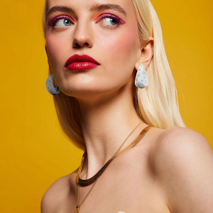 The Silver Fizzy Hoops by Minnie Lane are a unique and stylish pair of large hoop earrings. They are crafted from sterling silver and feature natural white topaz stones scattered across a polished dome surface, inspired by the night sky. The earrings are designed with sterling silver posts to avoid ear sensitivities, making them both beautiful and comfortable for all-day wear.