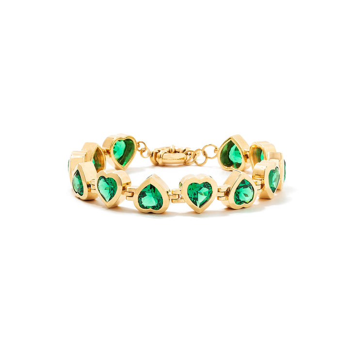 The Large Heartthrob Bracelet - Emerald by Minnie Lane is a romantic and stackable piece. Crafted from 14k gold plated over brass with natural gemstones, it allows you to literally wear your heart on your sleeve. The bracelet has a luxurious feel and is perfect for piling on for the ultimate impact stack or as a friendship bracelet.