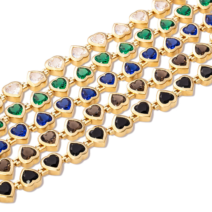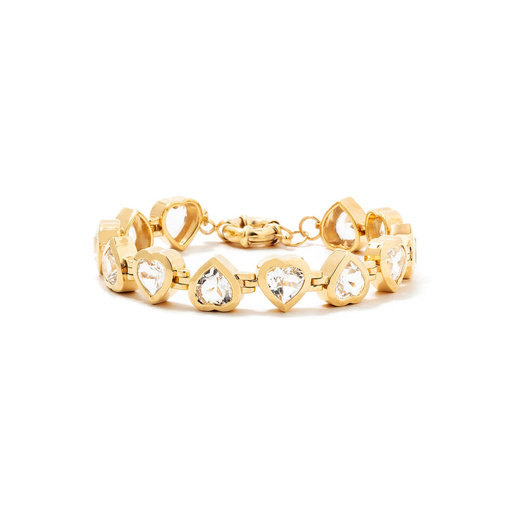 The Large Heartthrob Bracelet - White Topaz by Minnie Lane is a romantic and stylish accessory. It is crafted in 14k gold plated over brass and features natural white topaz stones. This bracelet is perfect for creating an ultimate impact stack or as a friendship bracelet.