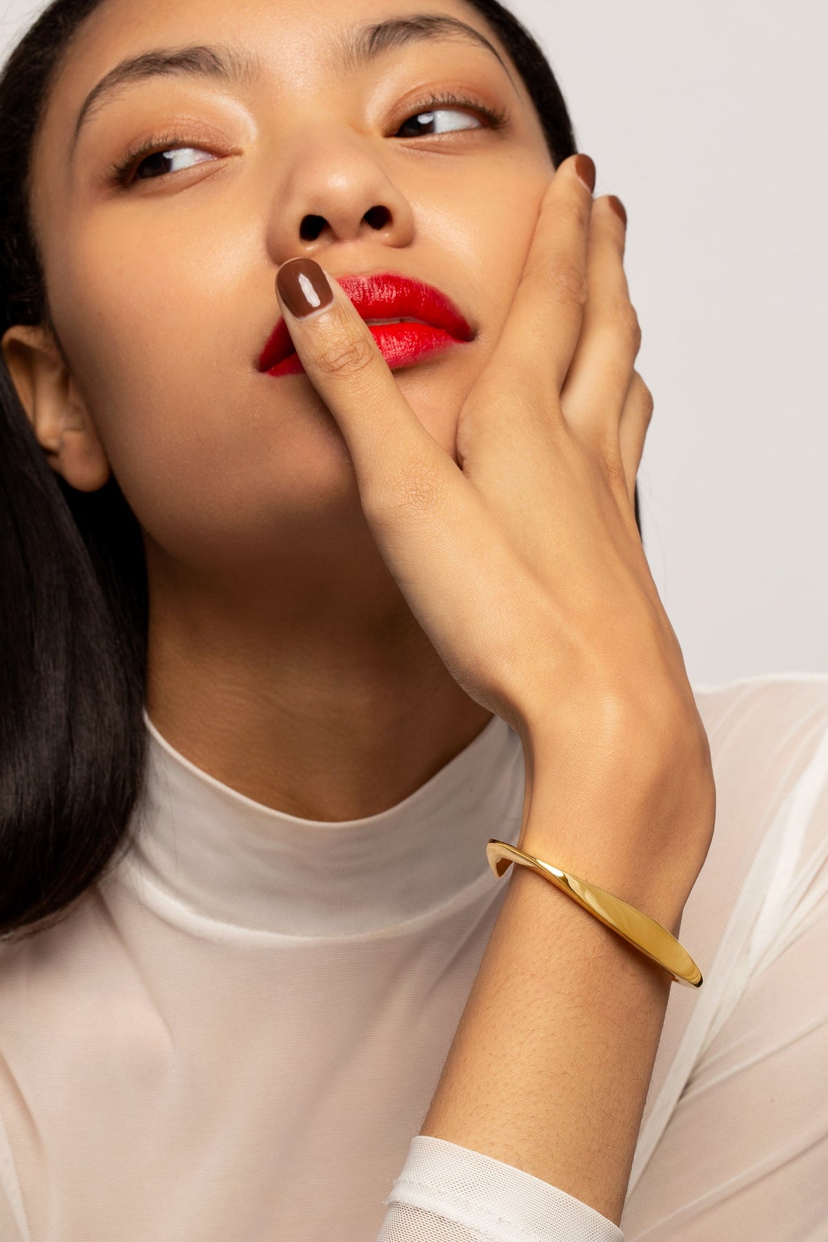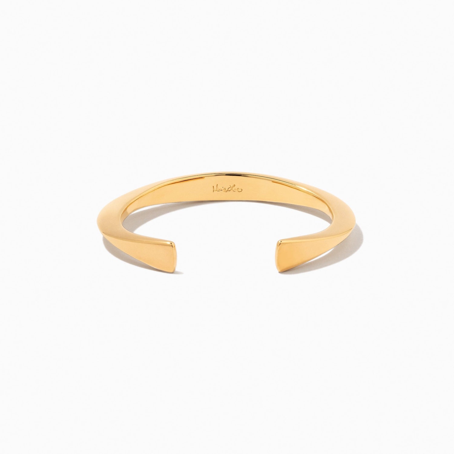 The Gold Ellsworth Cuff by Minnie Lane is a stylish and versatile bracelet. Designed in 14k gold plated over brass, this cuff is hand-hammered for a unique texture. It is also available with different gemstones, making it a piece that can be personalized. The open design allows it to be adjusted for a perfect fit, and its classic elegance makes it a staple for any jewelry collection.