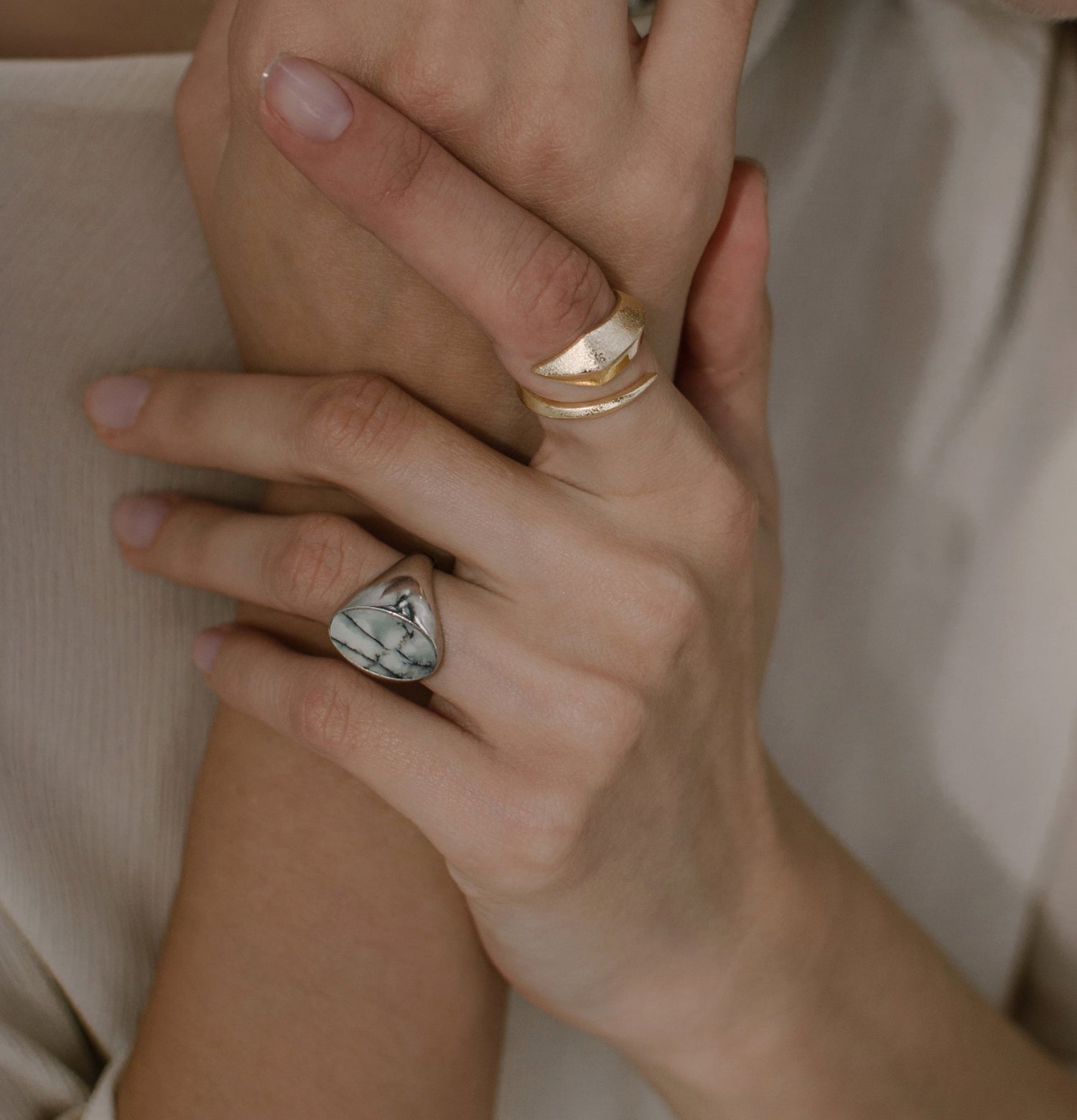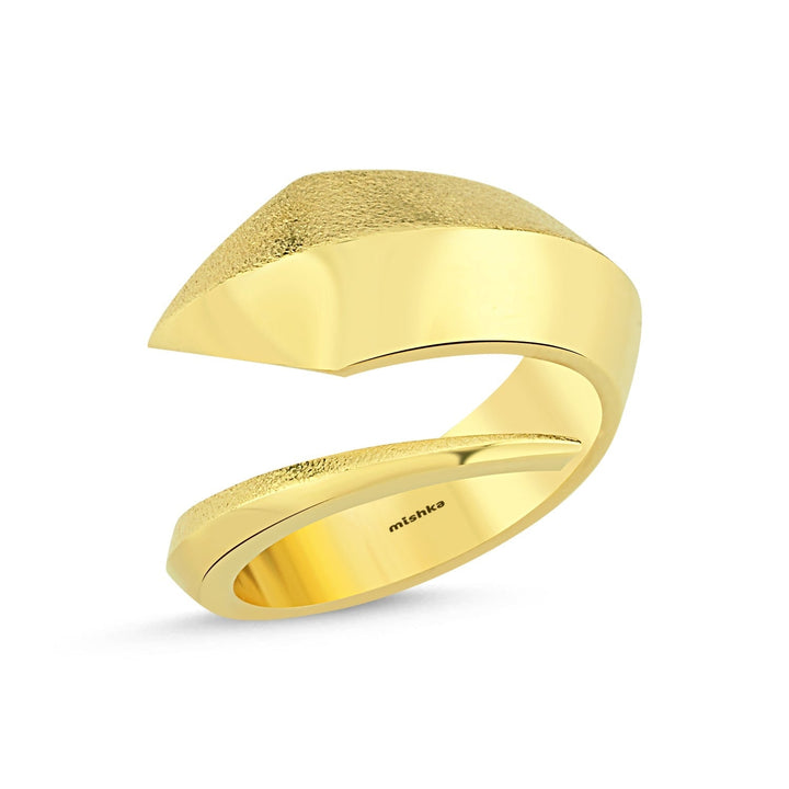 This Fluid Ring Gold by Mishka is a luxurious and artistic piece inspired by the sinuous movements of snakes. The ring features a tactile, sand-blasted finish that mimics the scales of a snake, while the polished gold adds a touch of sophistication and contrast. Its slightly adjustable design ensures a comfortable fit. This ring is a bold statement piece for anyone who appreciates modern, unisex jewelry that is both stylish and meaningful.