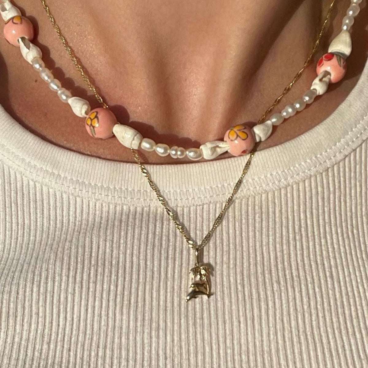 The That Night In Acapulco Necklace by Miss May the Brand is an elegant and timeless piece. Crafted from 14-karat solid gold, the pendant features a detailed dolphin leaping beside a finely sculpted palm tree. The pendant is paired with a classic rope chain, making it a sophisticated and durable accessory for daily wear or special occasions.