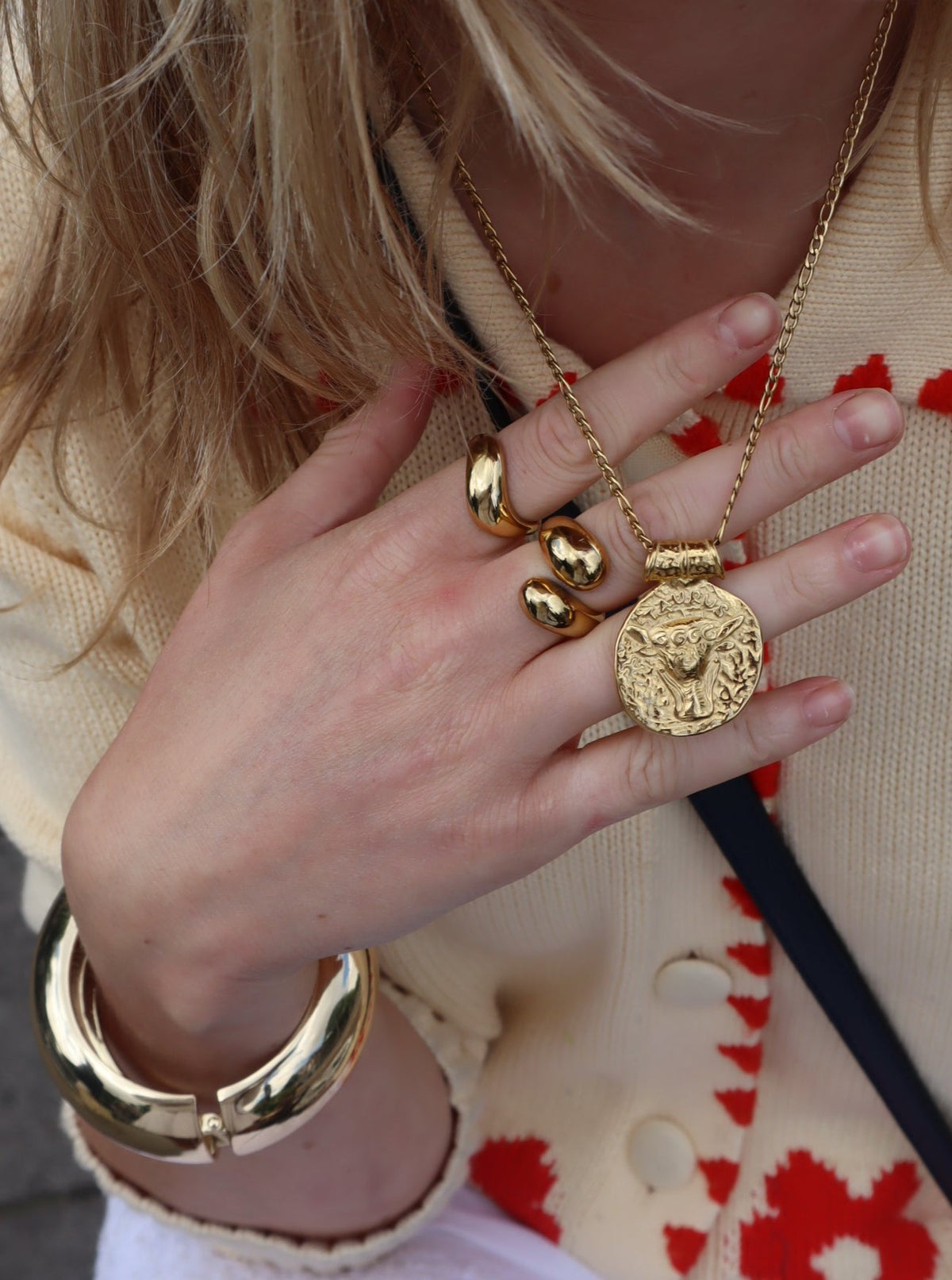 This necklace charm has a thick layer of 18k gold plating over stainless steel. The piece is waterproof and comes with a free pouch. It is available with or without a chain.