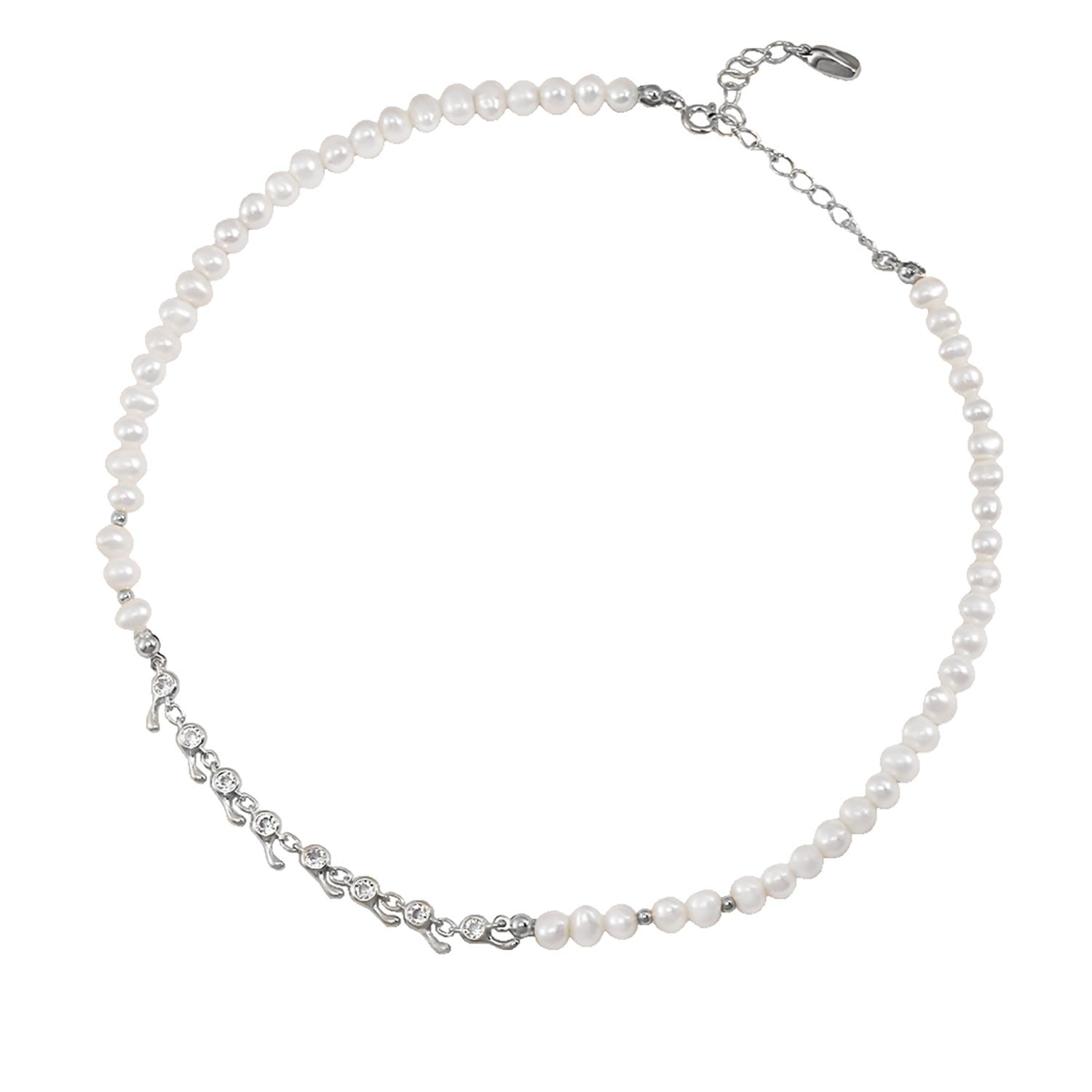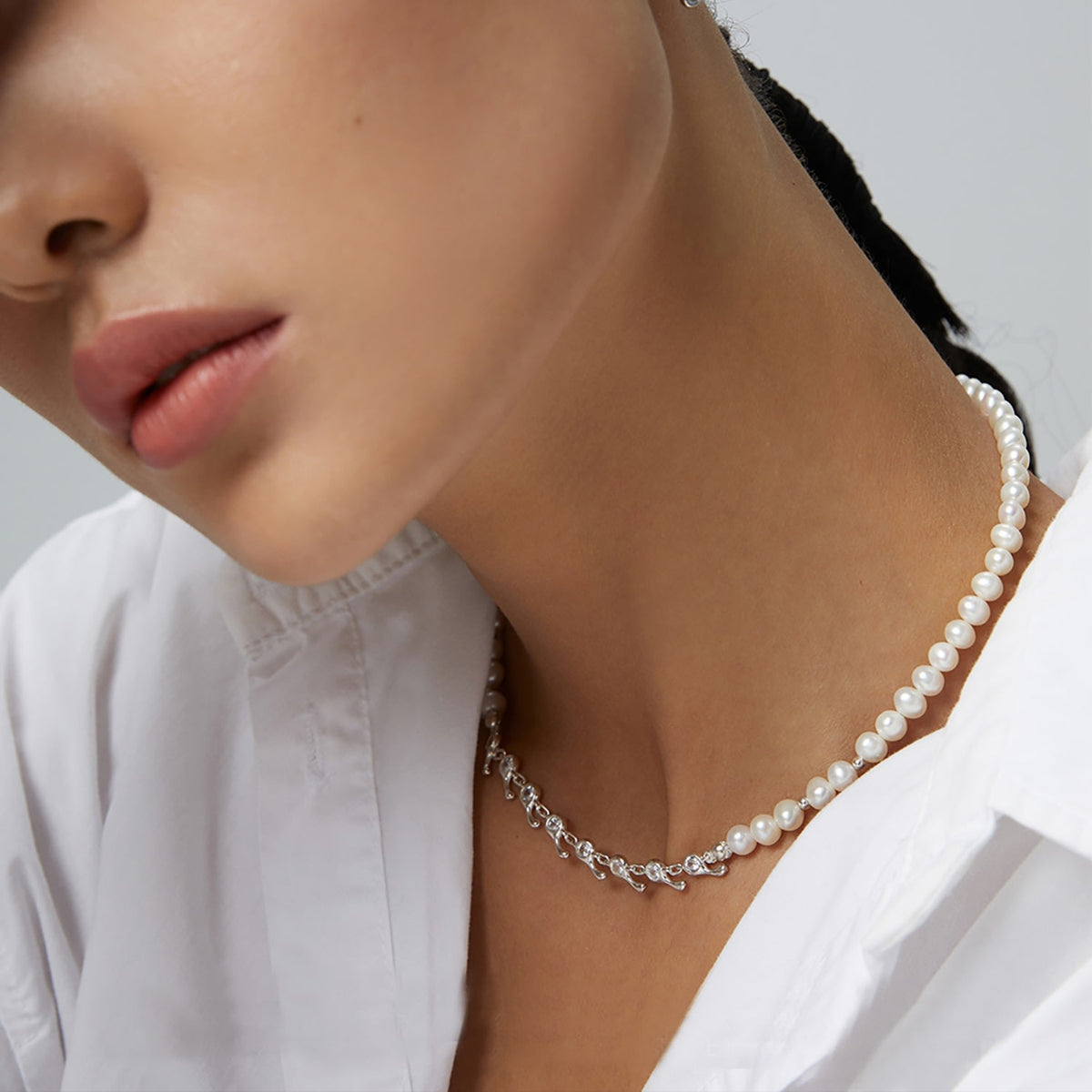 This pearl choker necklace is made of sterling silver and features freshwater pearls and zircon stones.