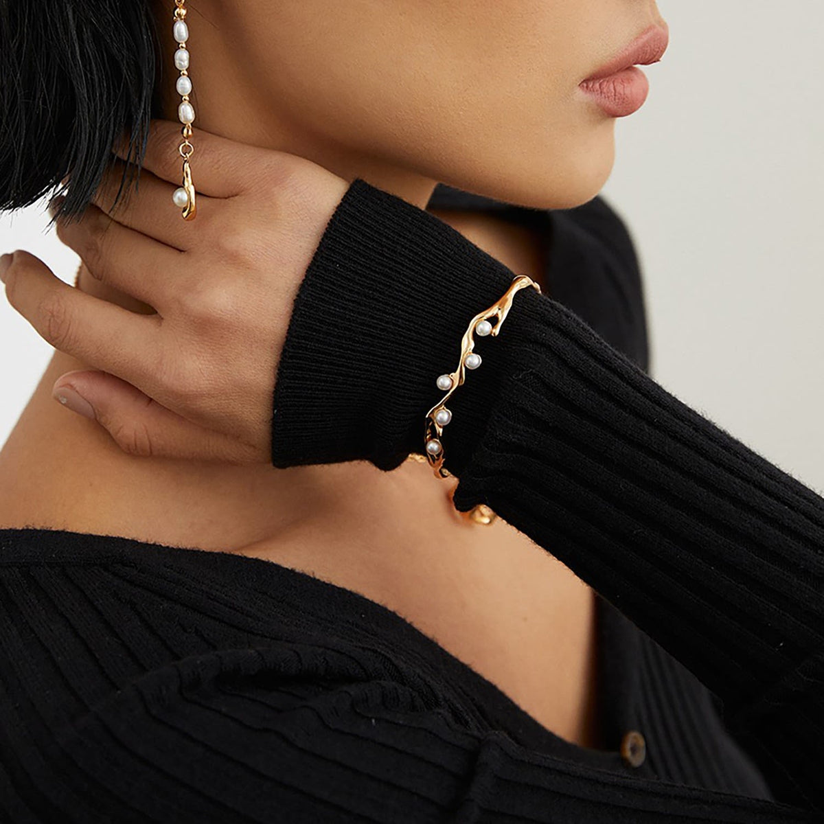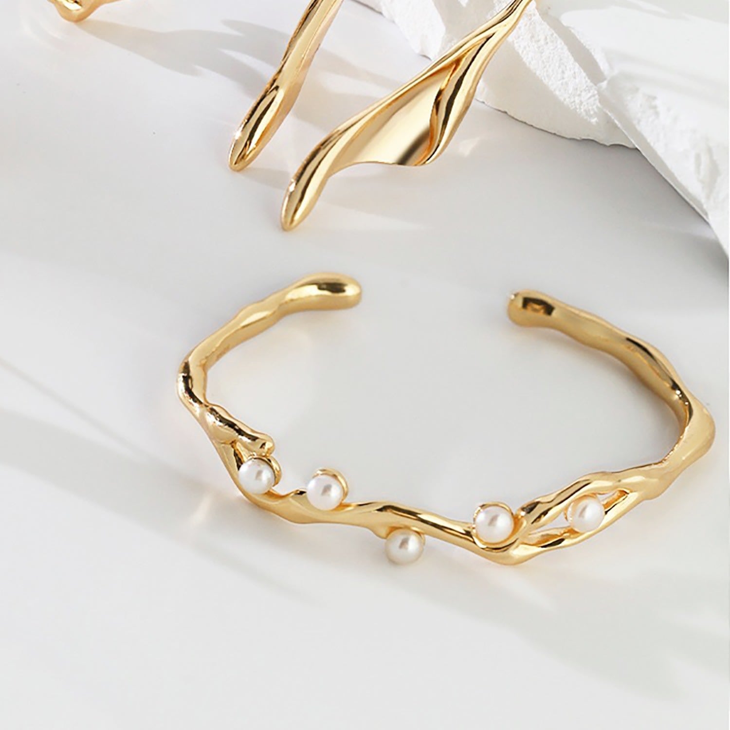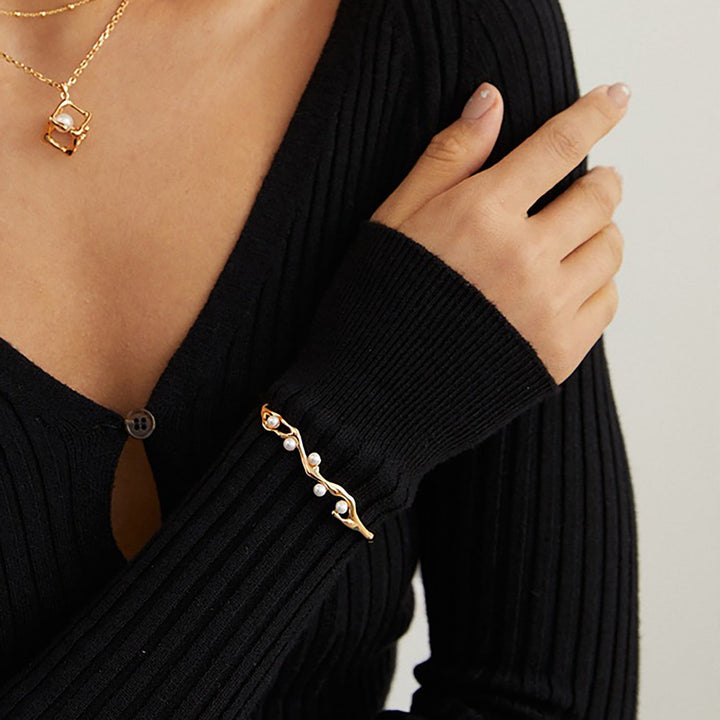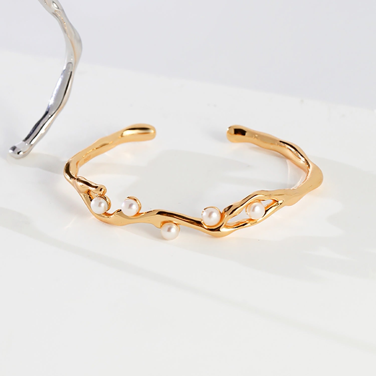 This bracelet is made of gold plated sterling silver. It is adorned with freshwater pearls.