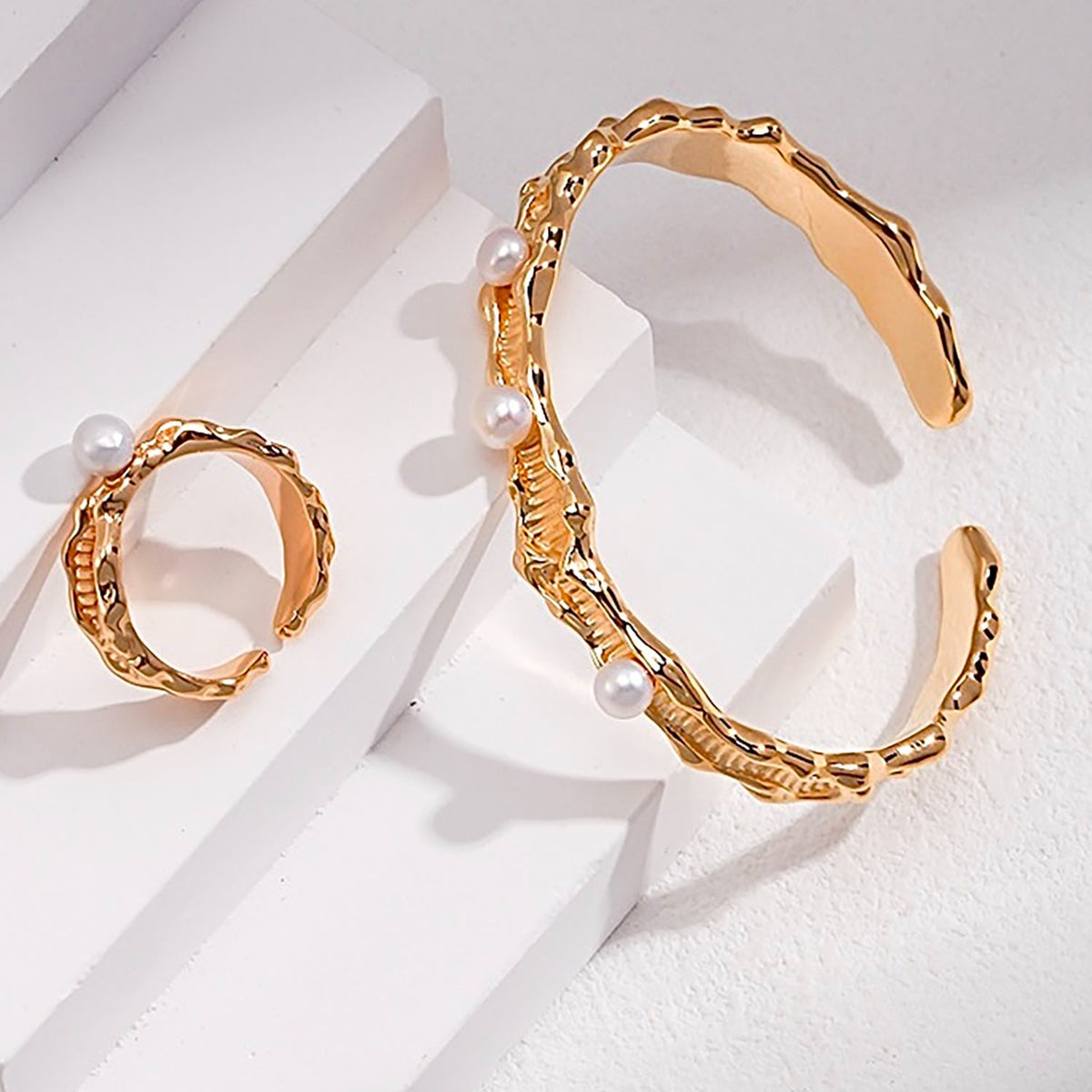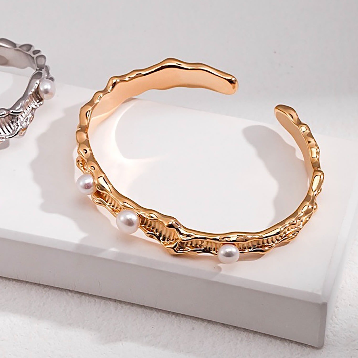 Wave Shaped 18K Gold Plated Sterling Silver With Pearls Open Bangle