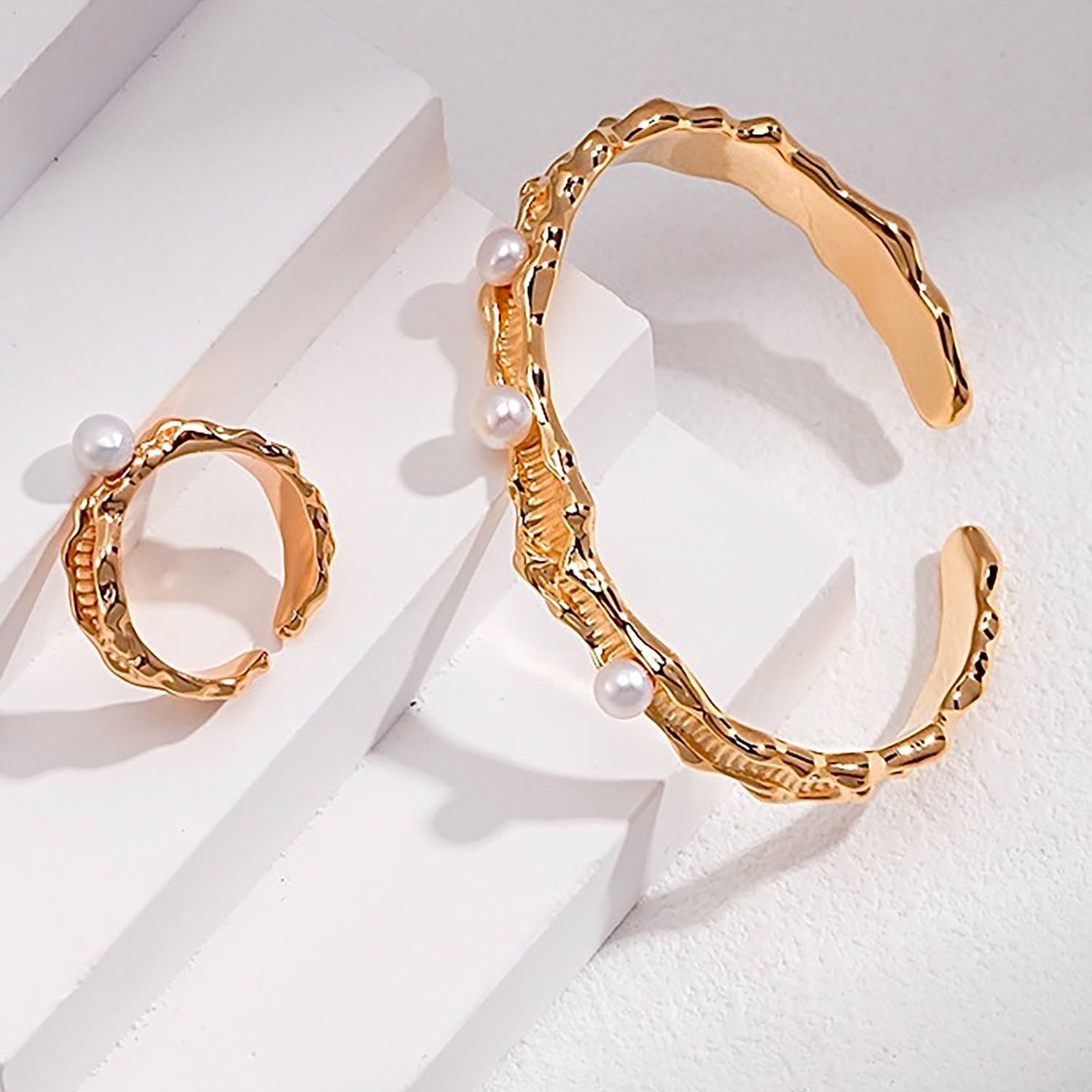 This Wave Shaped Open Bangle by Ms. Donna captures the romance and tranquility of the sea. The 18k gold-plated sterling silver band is designed in a beautiful wave-like shape, cradling a luminous pearl at its center. This bracelet is perfect for adding a touch of elegance and natural beauty to any outfit, reminiscent of a moonlit night on the water.